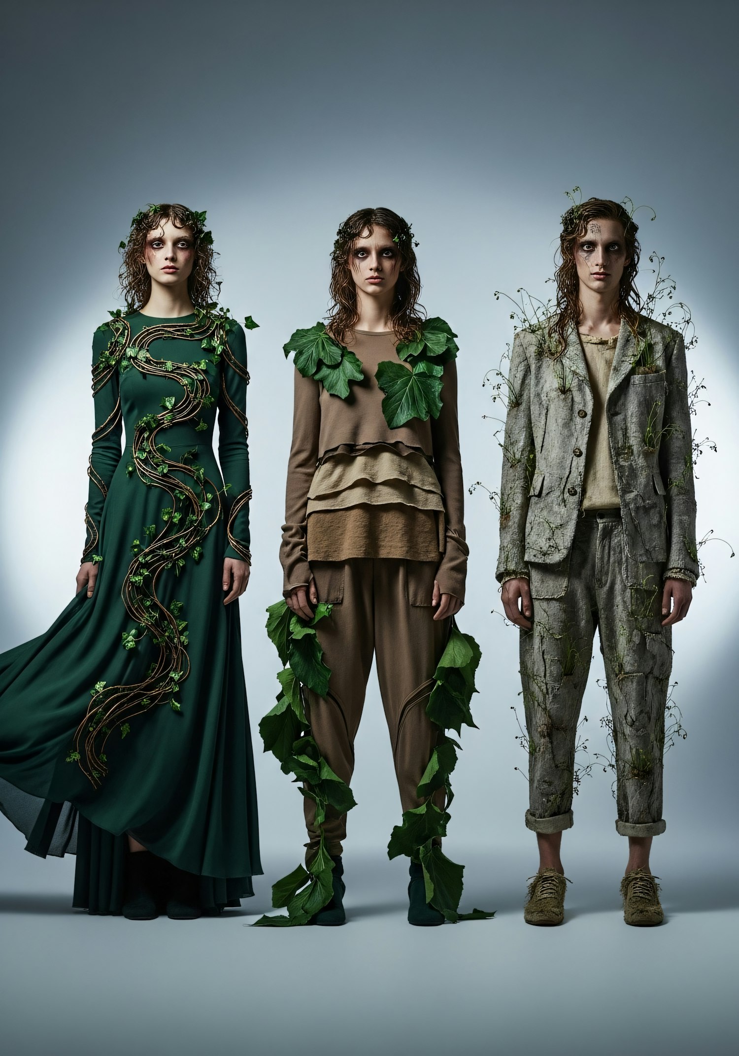Three individuals in nature-inspired outfits, featuring vines, leaves, and bark textures, standing against a neutral background.