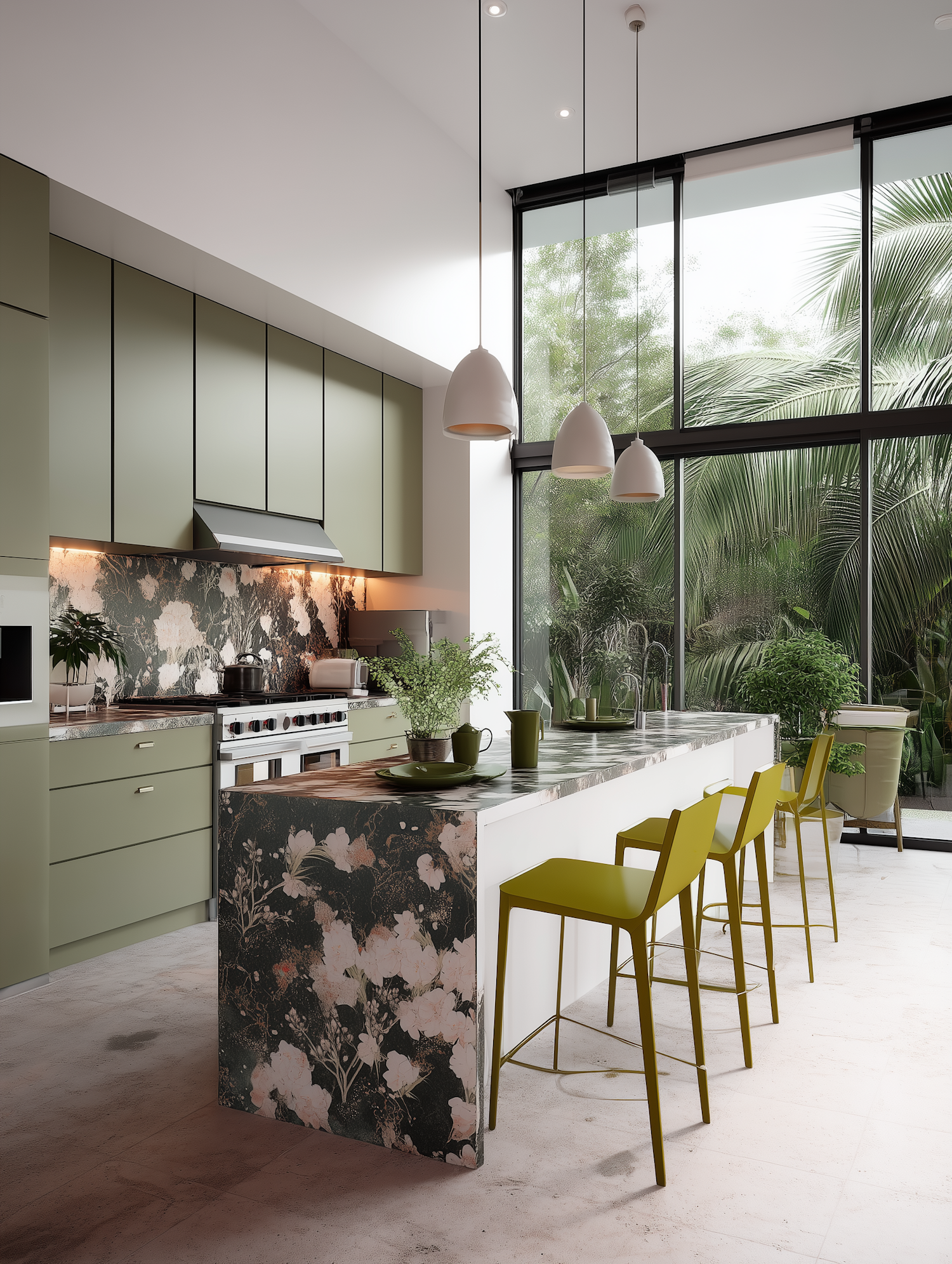 Modern kitchen with olive green cabinets, floral accents, and large windows overlooking lush greenery. Sleek bar stools and pendant lights add style.