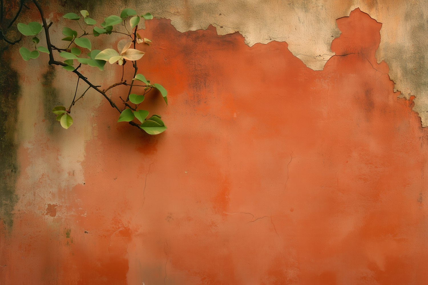 A weathered orange wall with peeling paint and a branch of green leaves extending across, blending nature and urban decay.
