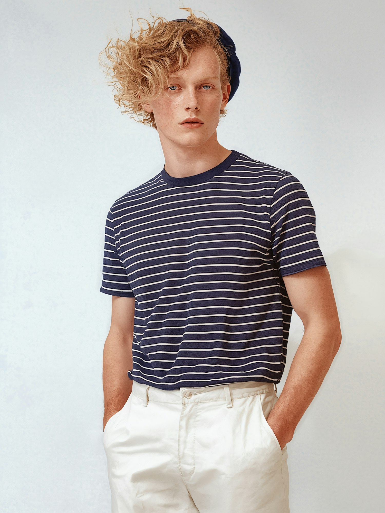 Stylish young man in a striped navy t-shirt and white trousers, accessorized with a navy beret, posing against a light background.