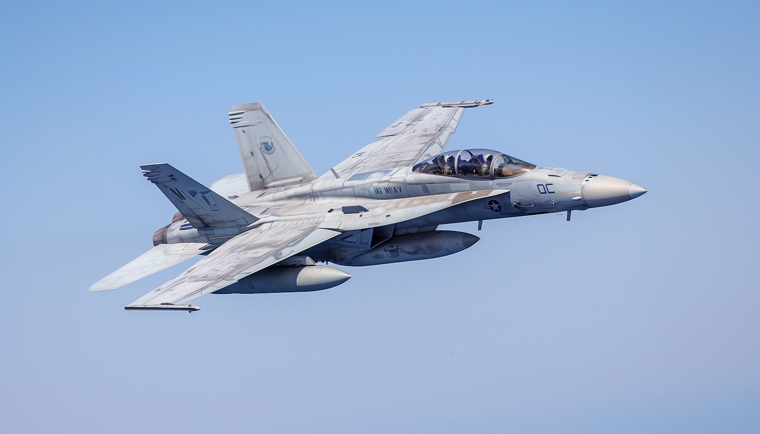 Military fighter jet in flight with gray camouflage, twin-tail design, and visible pilots in the cockpit against a clear blue sky.