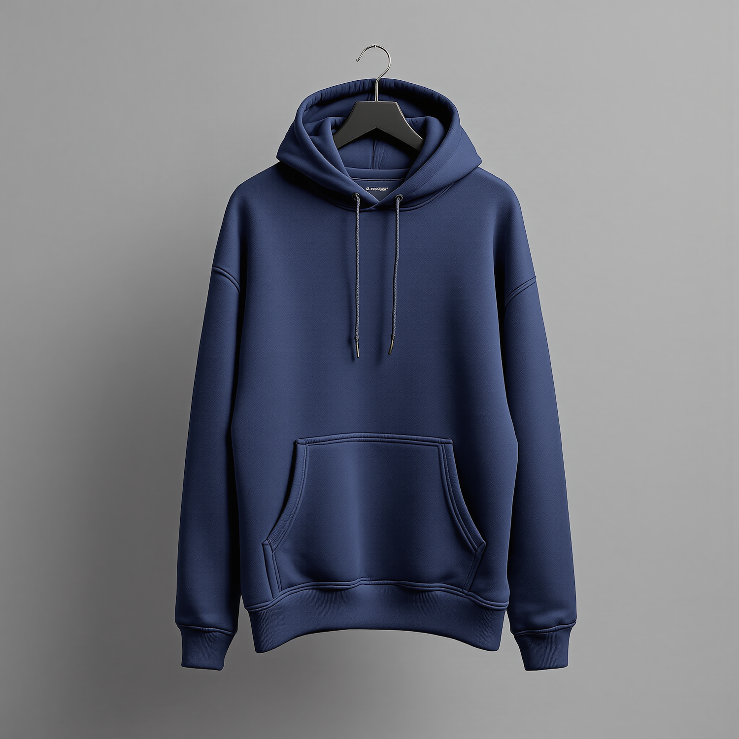 A navy blue hoodie with a front pocket and drawstring hood, displayed on a hanger against a gray background.