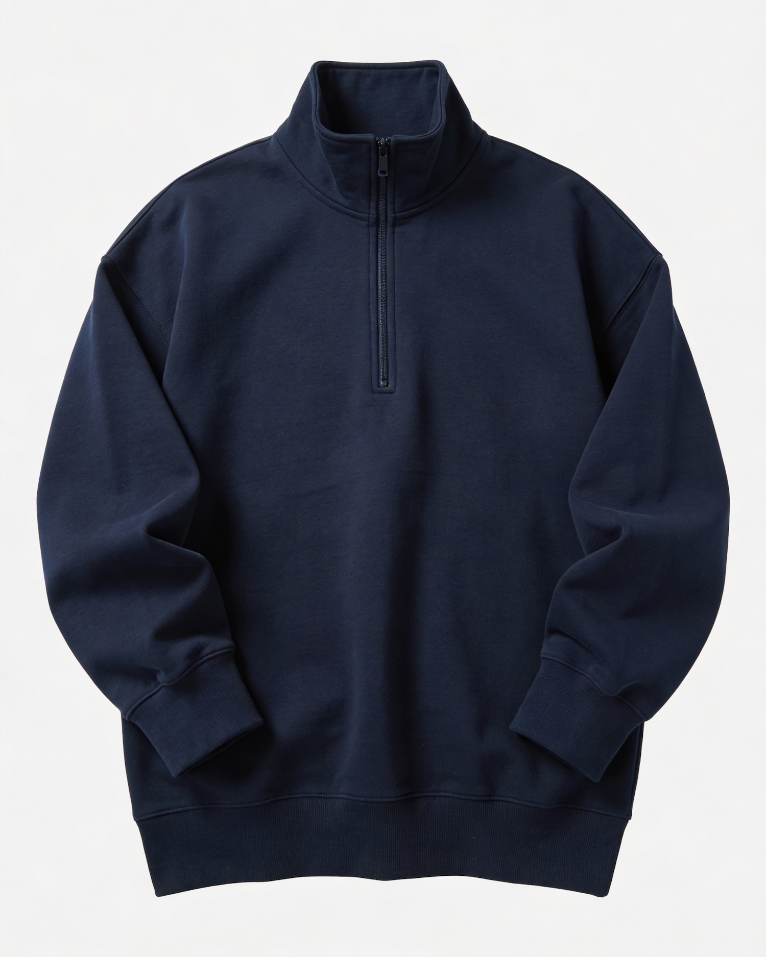 Ultra-realistic studio product shot of a minimalist navy blue zip-up sweatshirt, not worn, displayed as a floating garment with natural drape and volume. The sweatshirt has a structured silhouette with a slightly boxy shape, medium-weight fabric, smooth matte finish, and subtle thickness. High stand-up funnel collar with a clean central zipper running from bottom hem to top of collar. Dropped shoulders, long sleeves with ribbed cuffs. Wide ribbed waistband at the bottom hem, slightly cinched. No logo, no print, no stitching decoration. Fabric appears soft, premium cotton blend or double-knit jersey. Front view, perfectly centered. Soft even studio lighting, no harsh shadows, white seamless background, professional e-commerce style, extremely sharp focus, high resolution, realistic textile texture, natural folds and gravity.