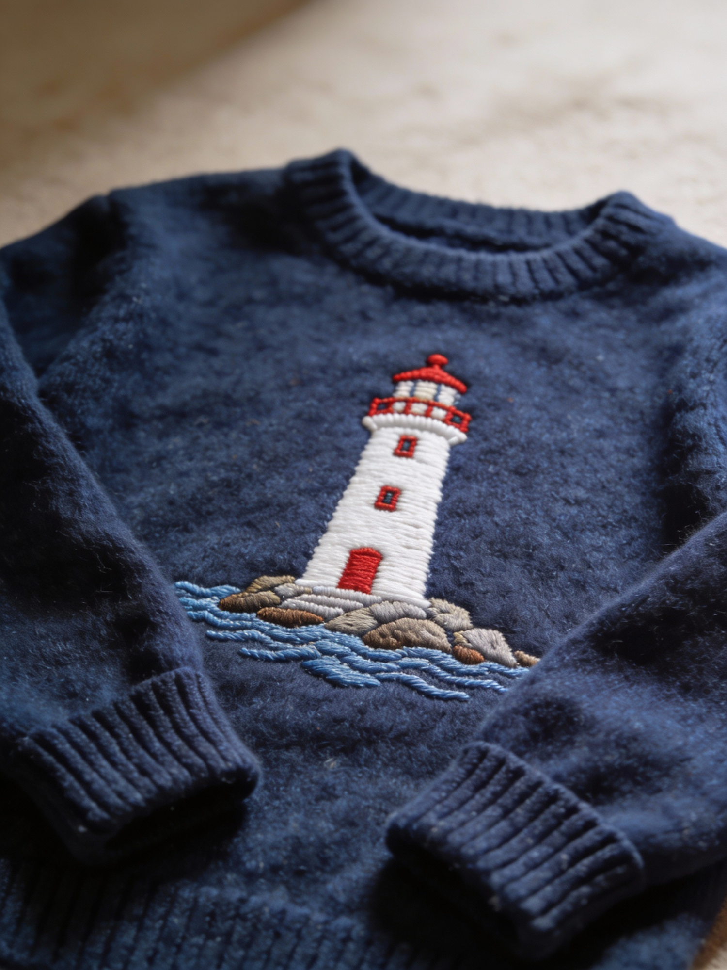 Navy blue sweater with a detailed embroidered lighthouse design, perfect for a cozy and stylish look.