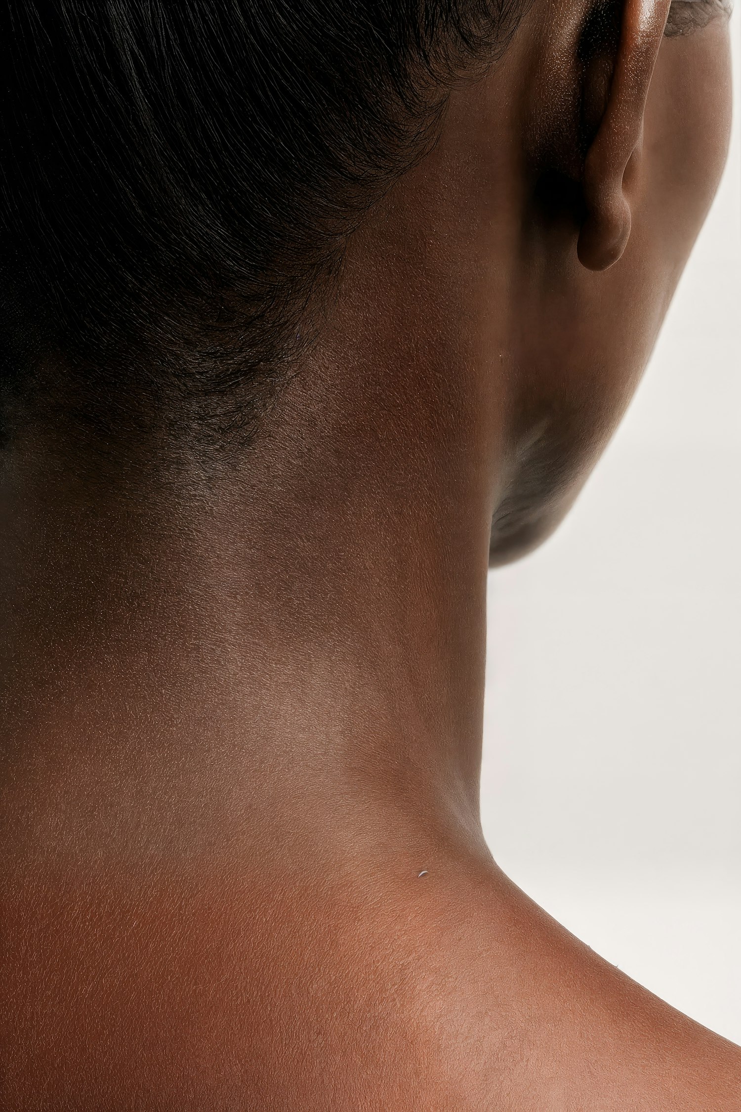 Close-up of the back of a person's neck with smooth, dark brown skin and short, neatly groomed black hair against a neutral background.