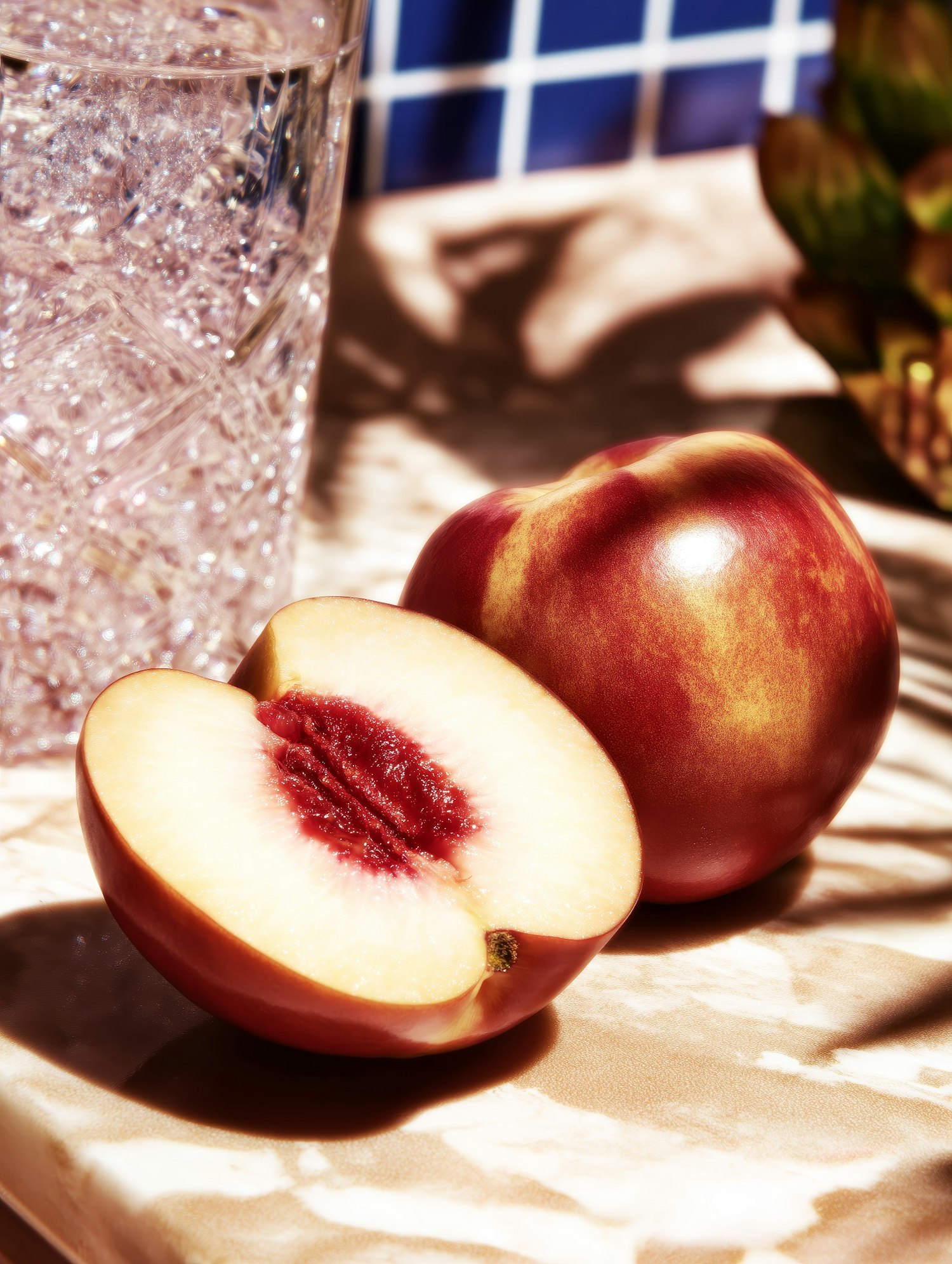 Juicy nectarine halves on a marble surface with a glass of ice water in a bright, summery setting.