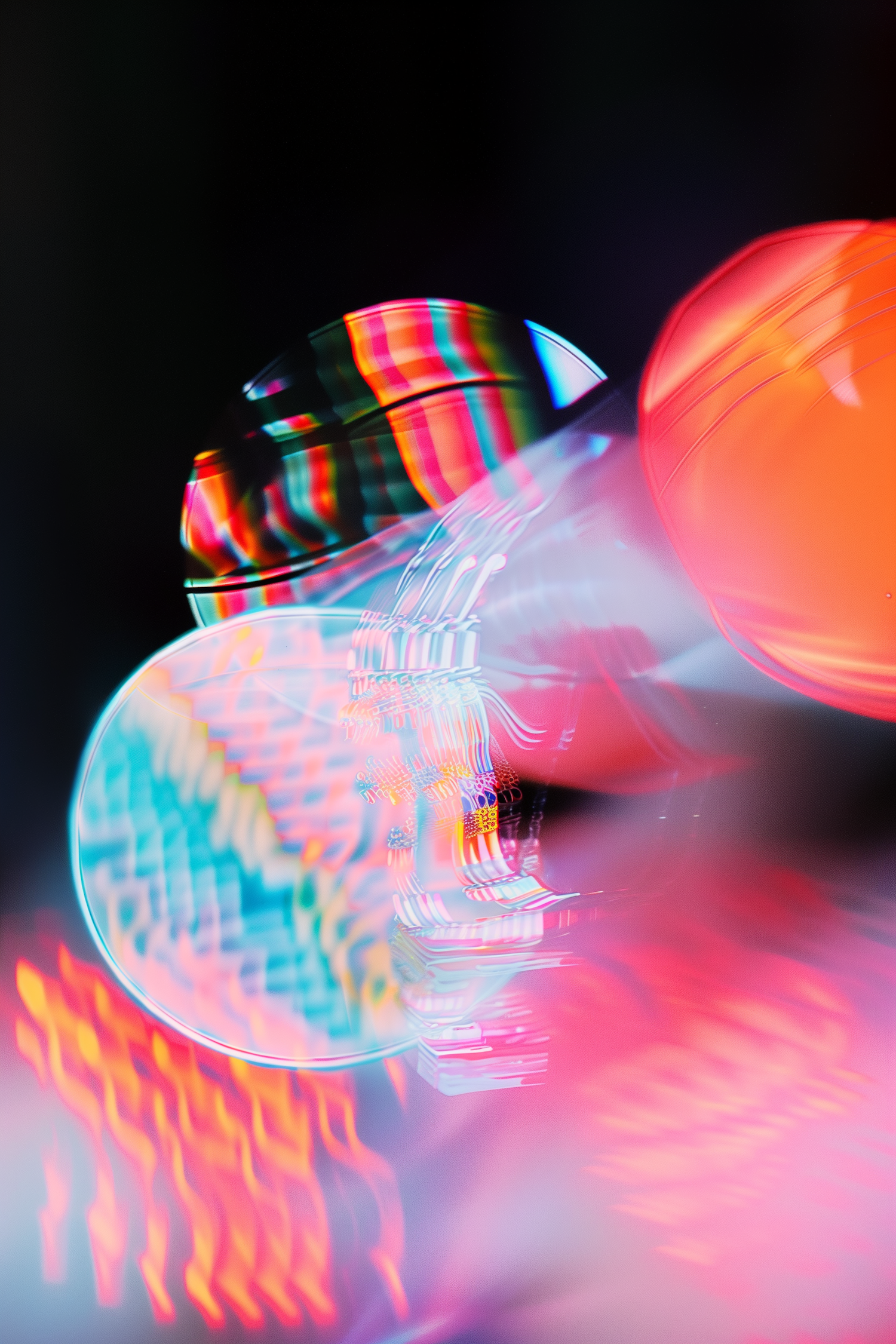 Abstract neon light art with vibrant colors and refracted patterns on a dark background, creating a futuristic and dynamic vibe.