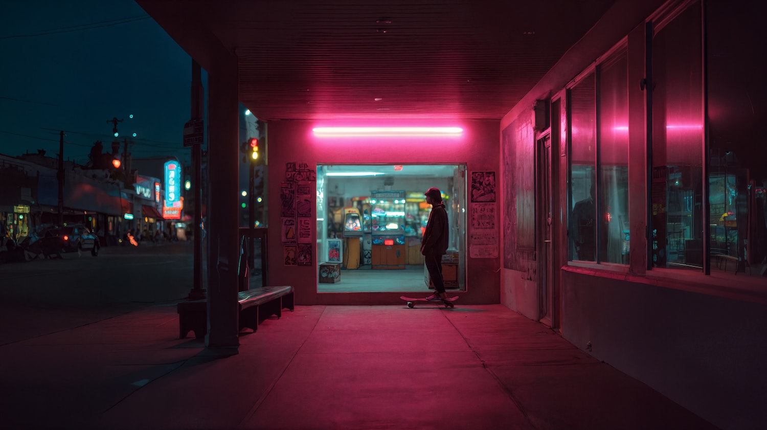 A skateboarder stands under pink neon lights outside an arcade at night, with vibrant colors contrasting the dark urban surroundings.