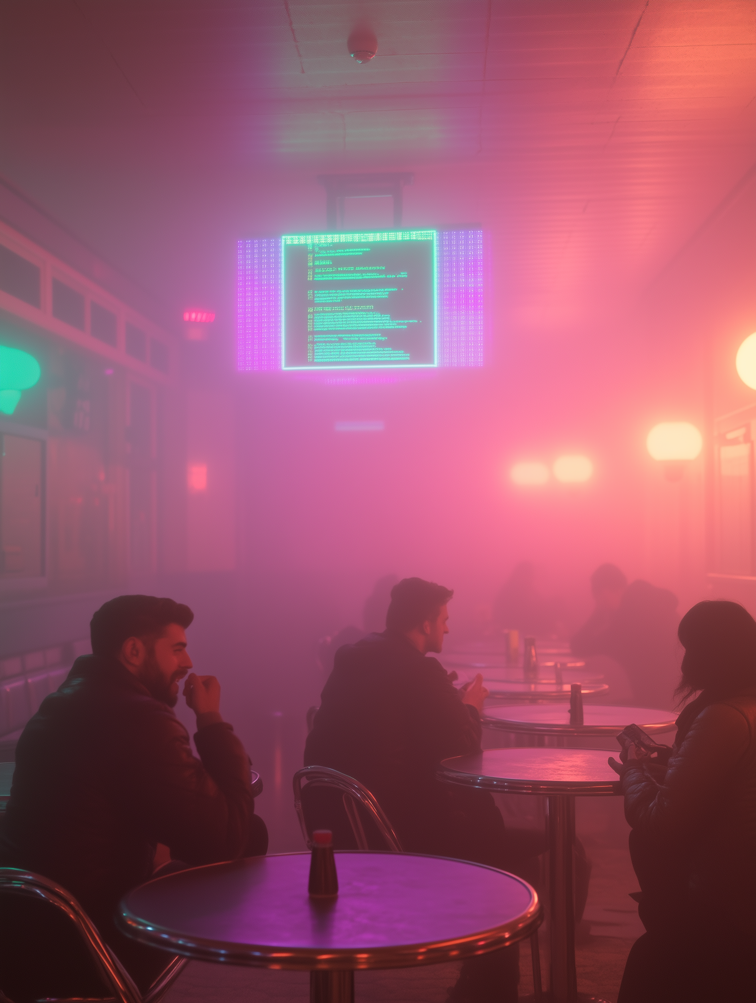 Retro-futuristic cafe with neon lights and a cyberpunk vibe, featuring patrons at metal tables under a glowing digital screen.