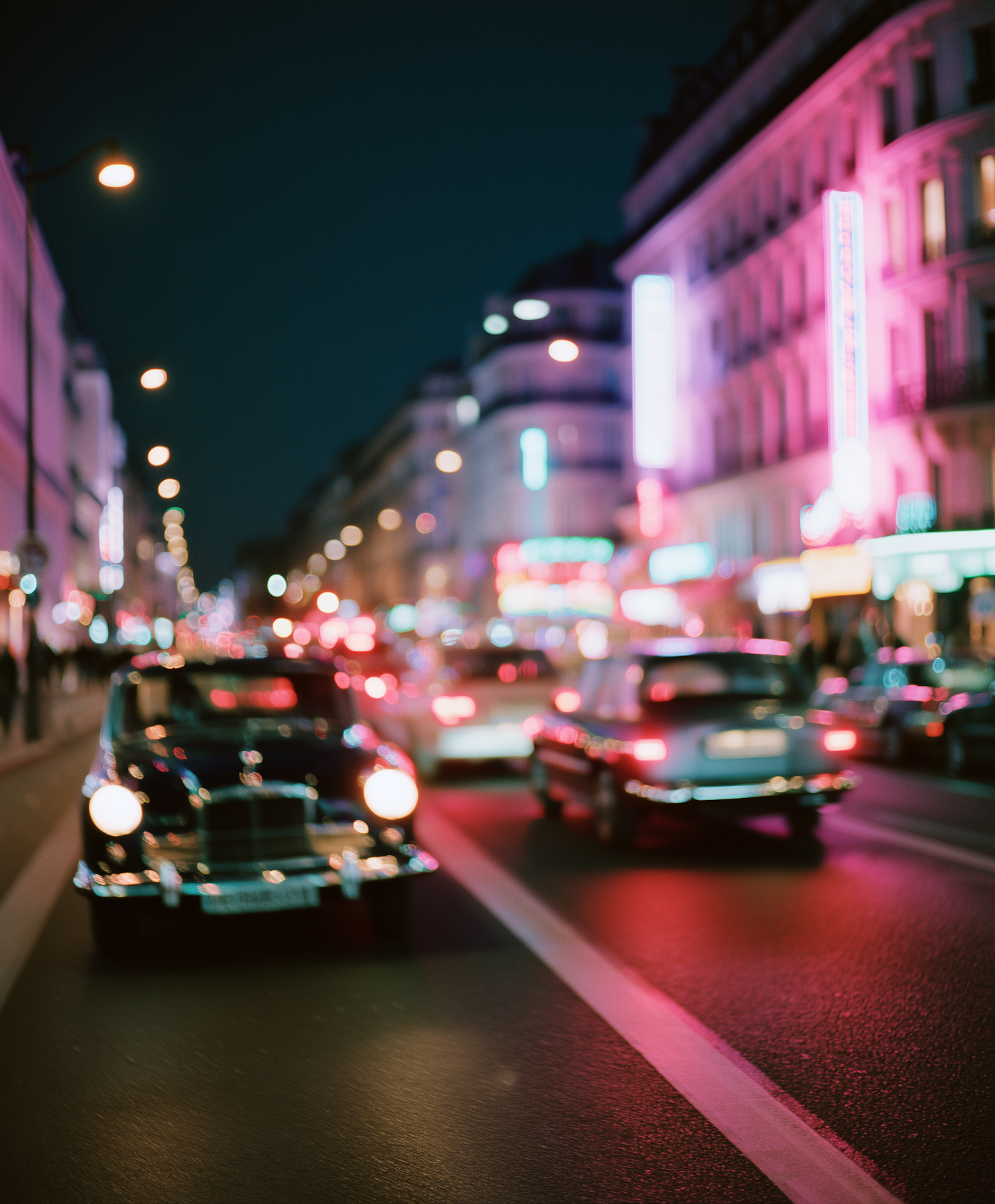 A classic car drives through a neon-lit city street at night, with vibrant reflections on the wet pavement creating a dynamic scene.