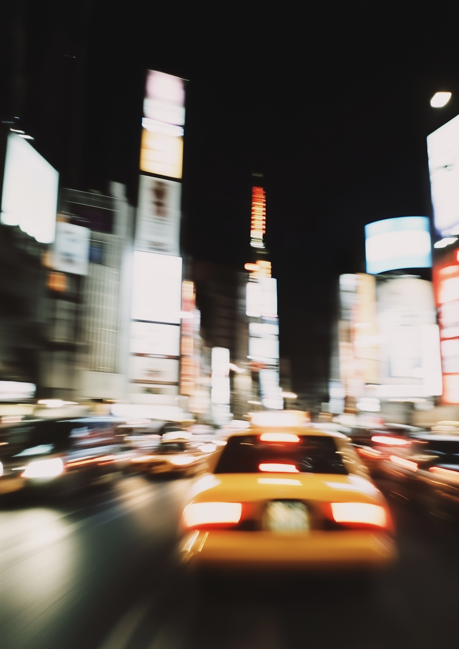 Blurred city night scene with neon lights, a yellow taxi in motion, and vibrant billboards creating a dynamic urban vibe.