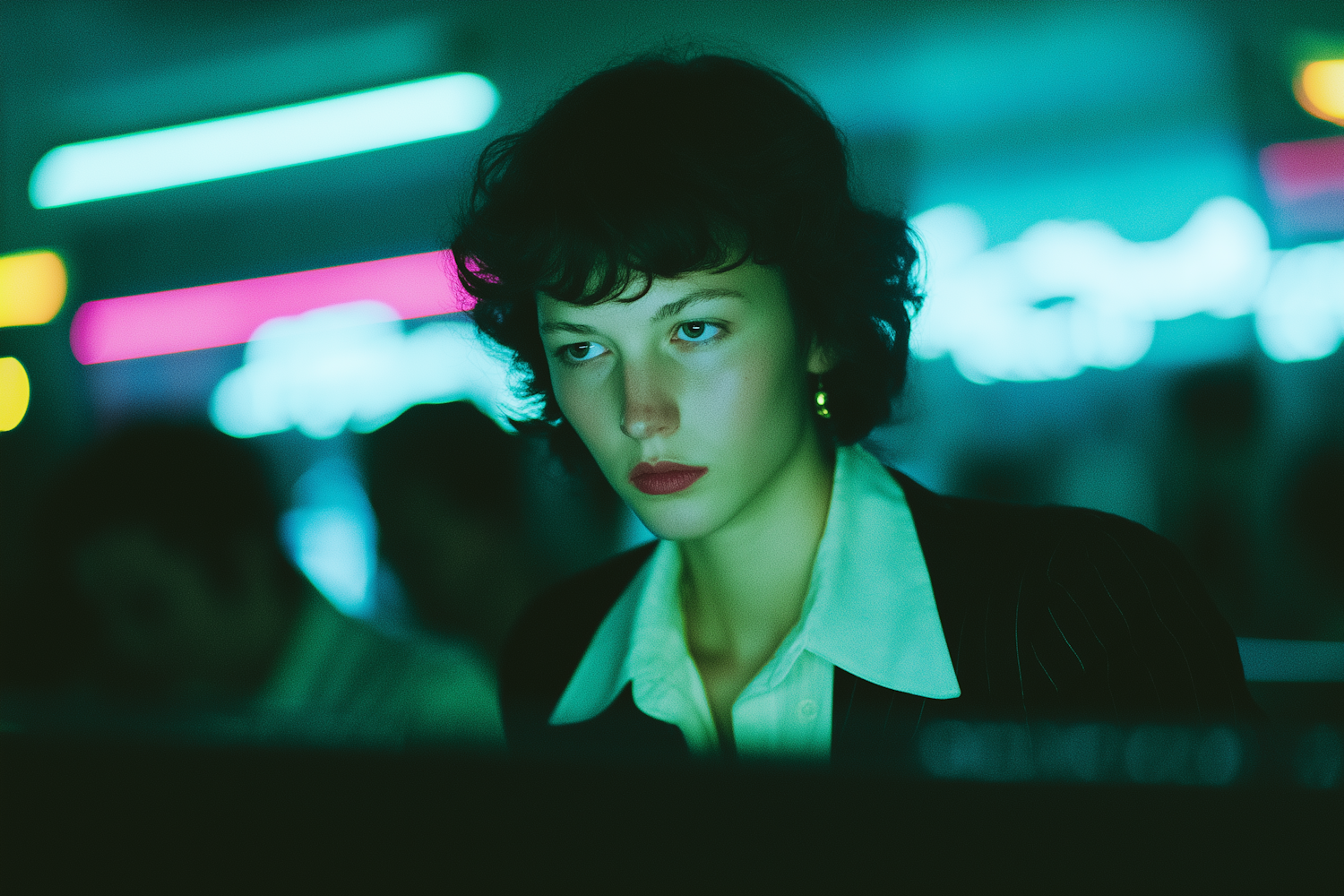 A person with short dark hair in a neon-lit setting, wearing a white shirt and dark jacket, with a focused expression.