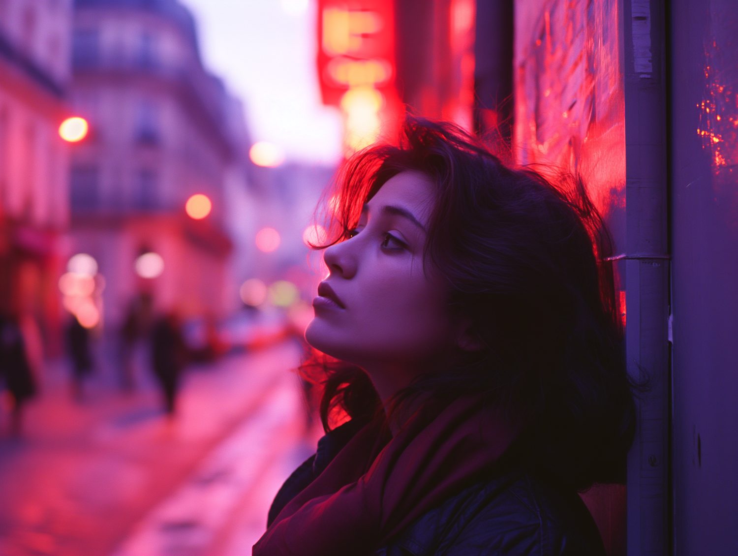 A young woman in a neon-lit city street, gazing upwards with a contemplative expression. Vibrant pink and purple hues dominate the scene.