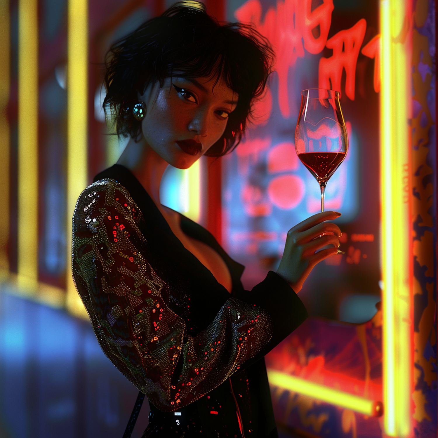 A chic woman in a sequined outfit holding a wine glass in a neon-lit urban setting. Bold makeup and vibrant colors add to the stylish vibe.