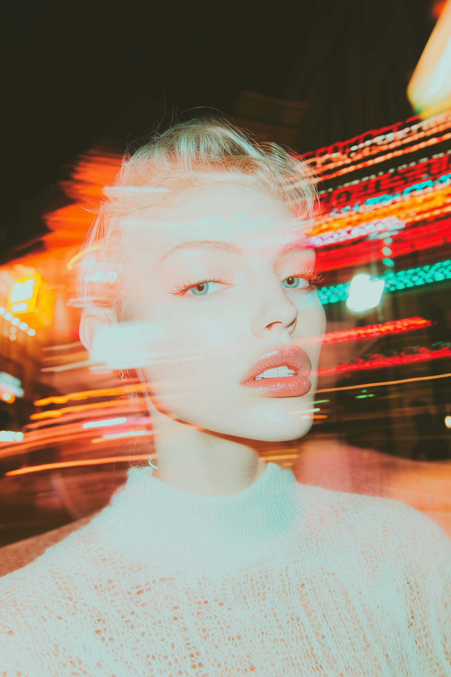 Close-up of a young woman with blonde hair and blue eyes, set against a vibrant blur of neon lights in red, green, and yellow hues.