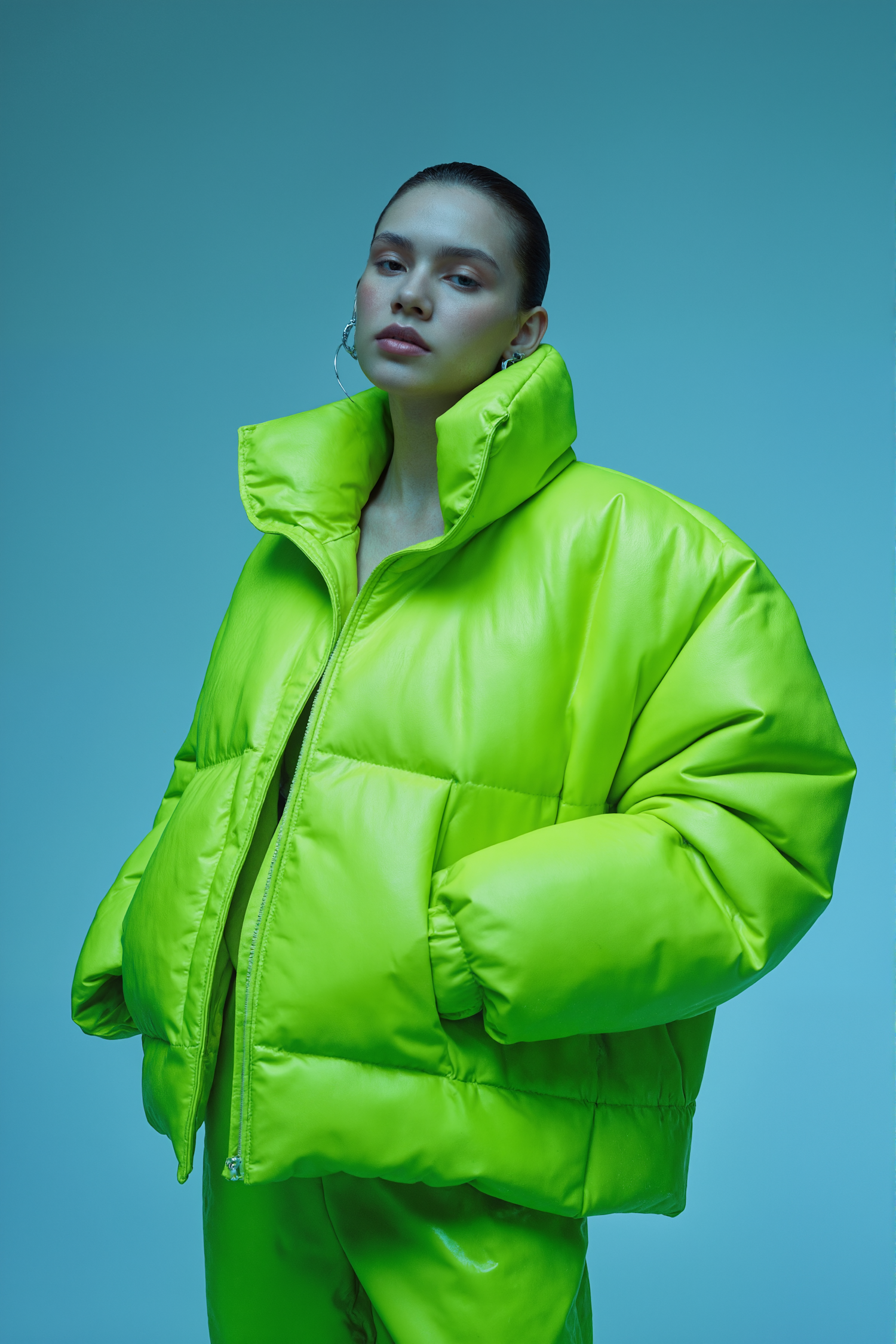 Woman in neon green puffer jacket against a blue background, exuding confidence and style with bold fashion and elegant accessories.