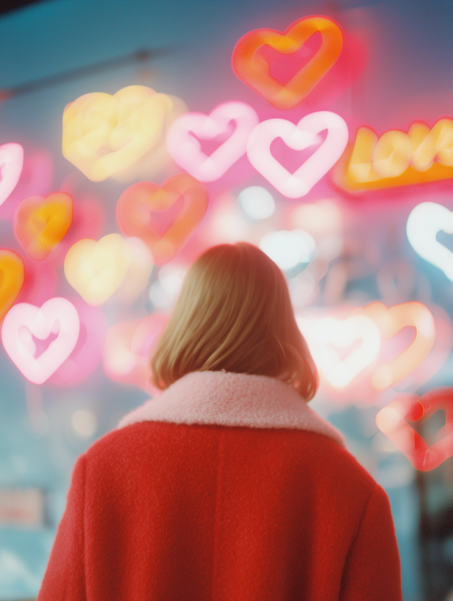 A person in a red coat stands before glowing neon heart signs, creating a vibrant and romantic atmosphere.