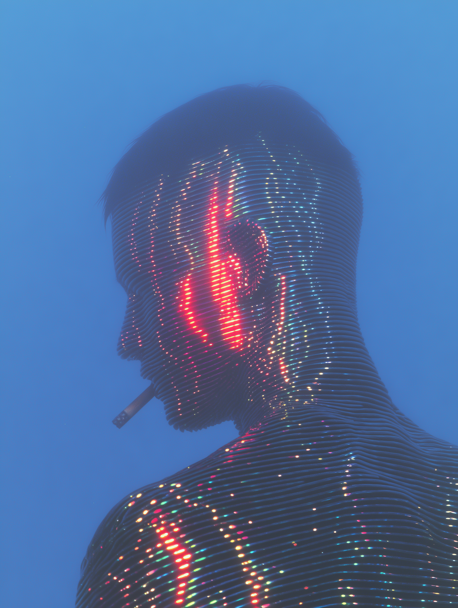 Abstract depiction of a figure radiating neon-striped lights against a blue backdrop, evoking themes of technology and transformation.
