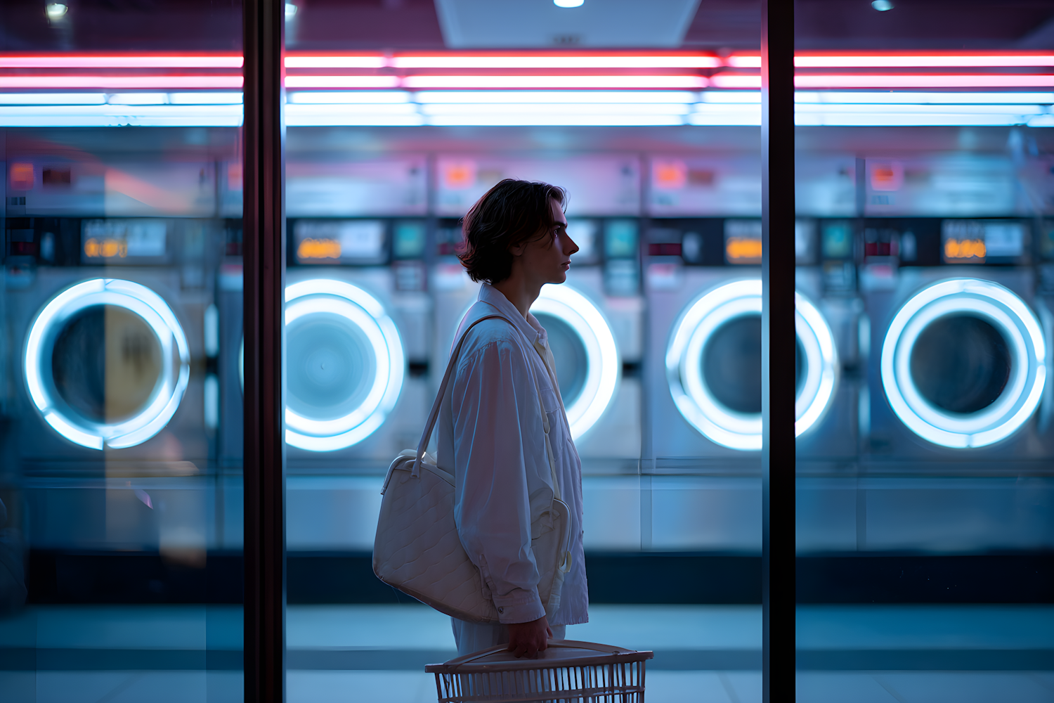 A person in a white outfit stands in a neon-lit laundromat, holding a basket, with glowing washing machines in the background.