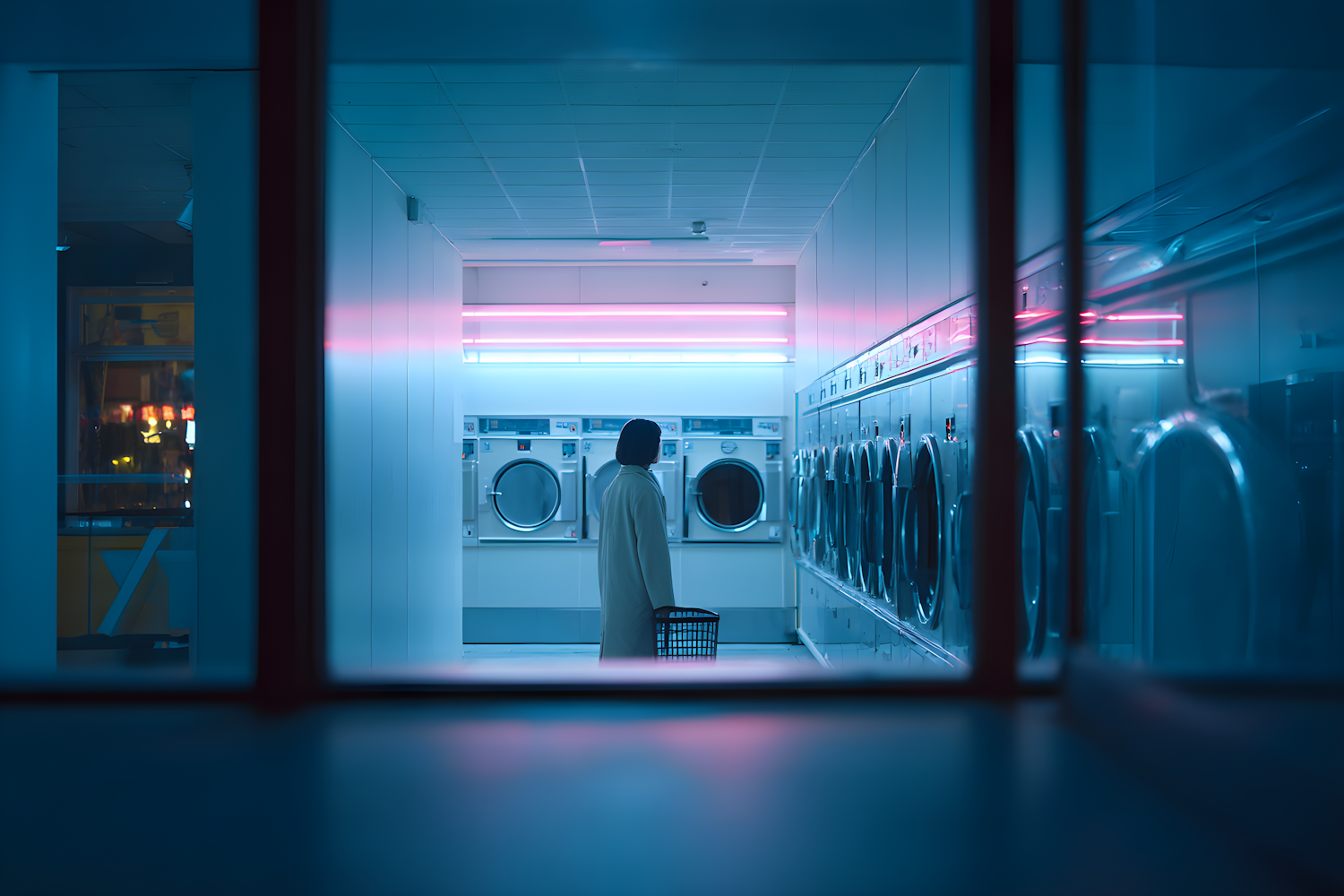 A person in a beige coat stands in a neon-lit laundromat, holding a basket and facing washing machines, framed by reflective glass.