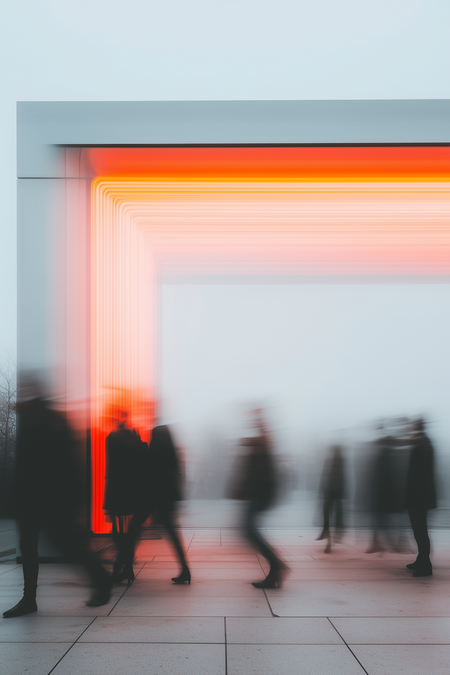 Abstract scene with glowing orange neon light and blurred silhouettes of people walking in a foggy, minimalist setting.