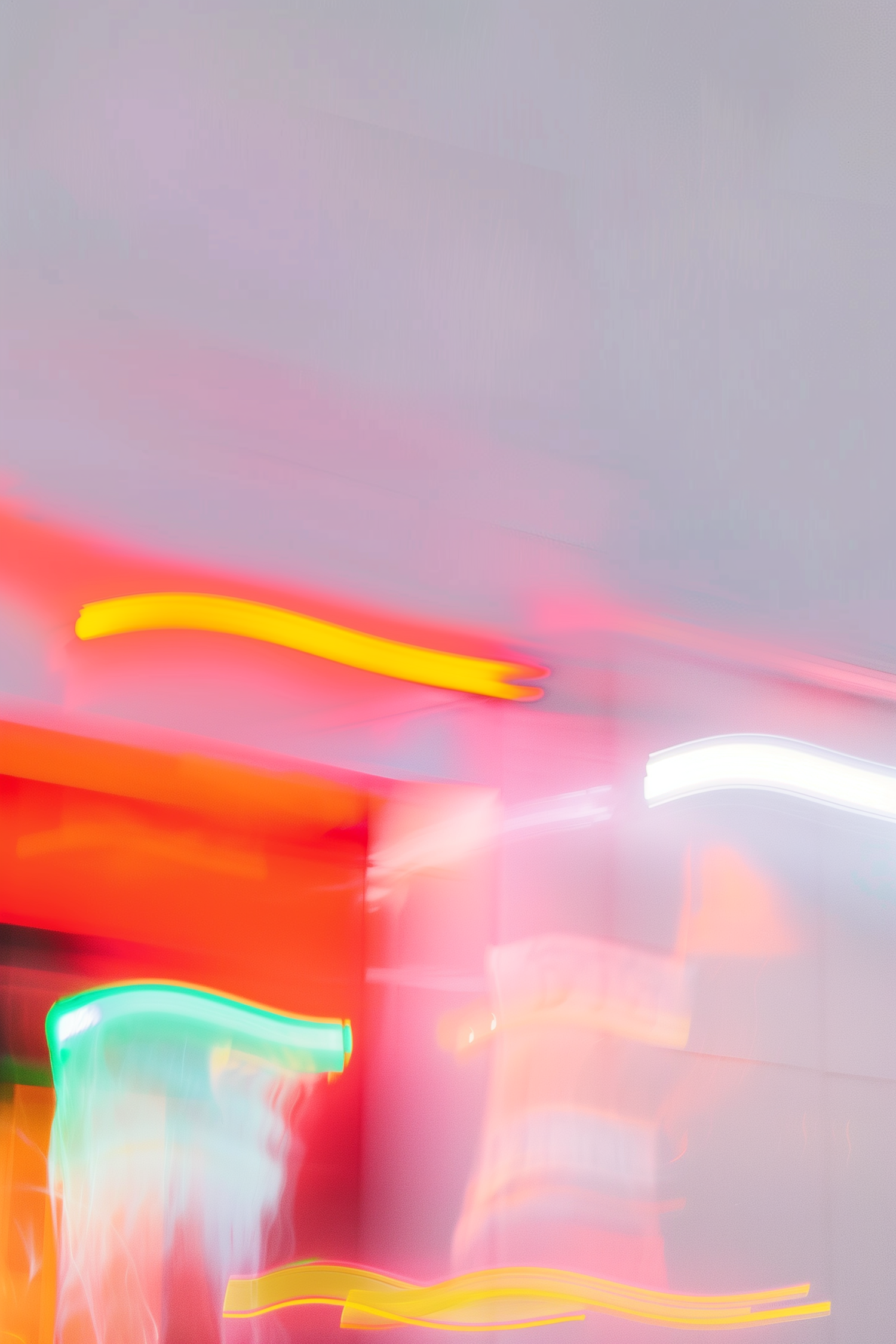 Abstract neon light streaks in red, yellow, green, and white create a dynamic, colorful composition with a dreamy, motion-filled vibe.