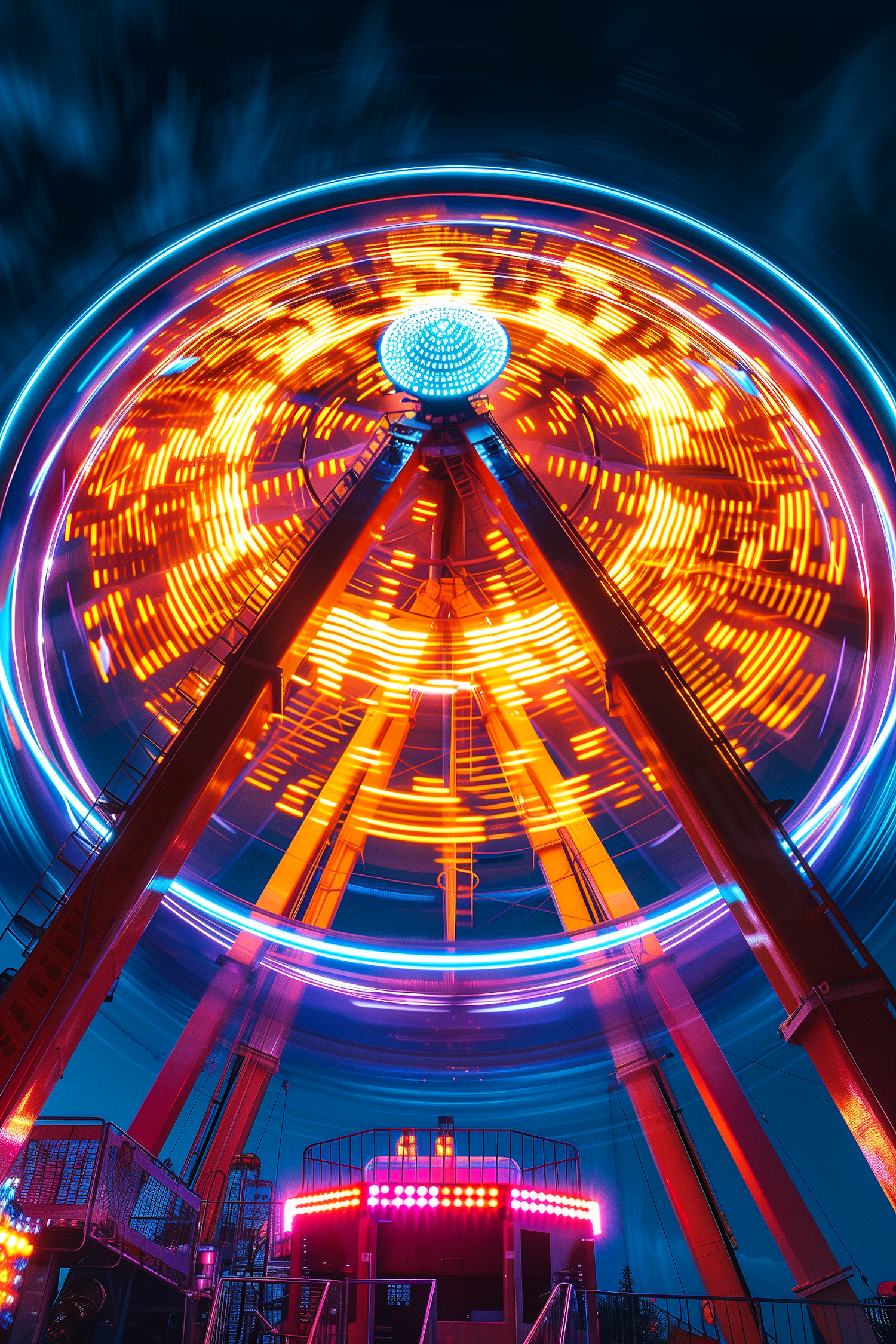 Vibrant Ferris wheel at night with dynamic orange and blue lights, captured in motion with a long exposure effect.
