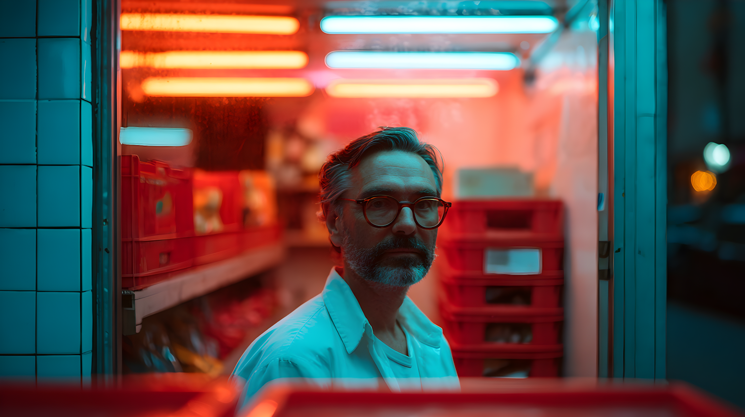 A man in glasses and a white shirt stands in a neon-lit room with red and blue tones, surrounded by red crates, creating a vibrant scene.