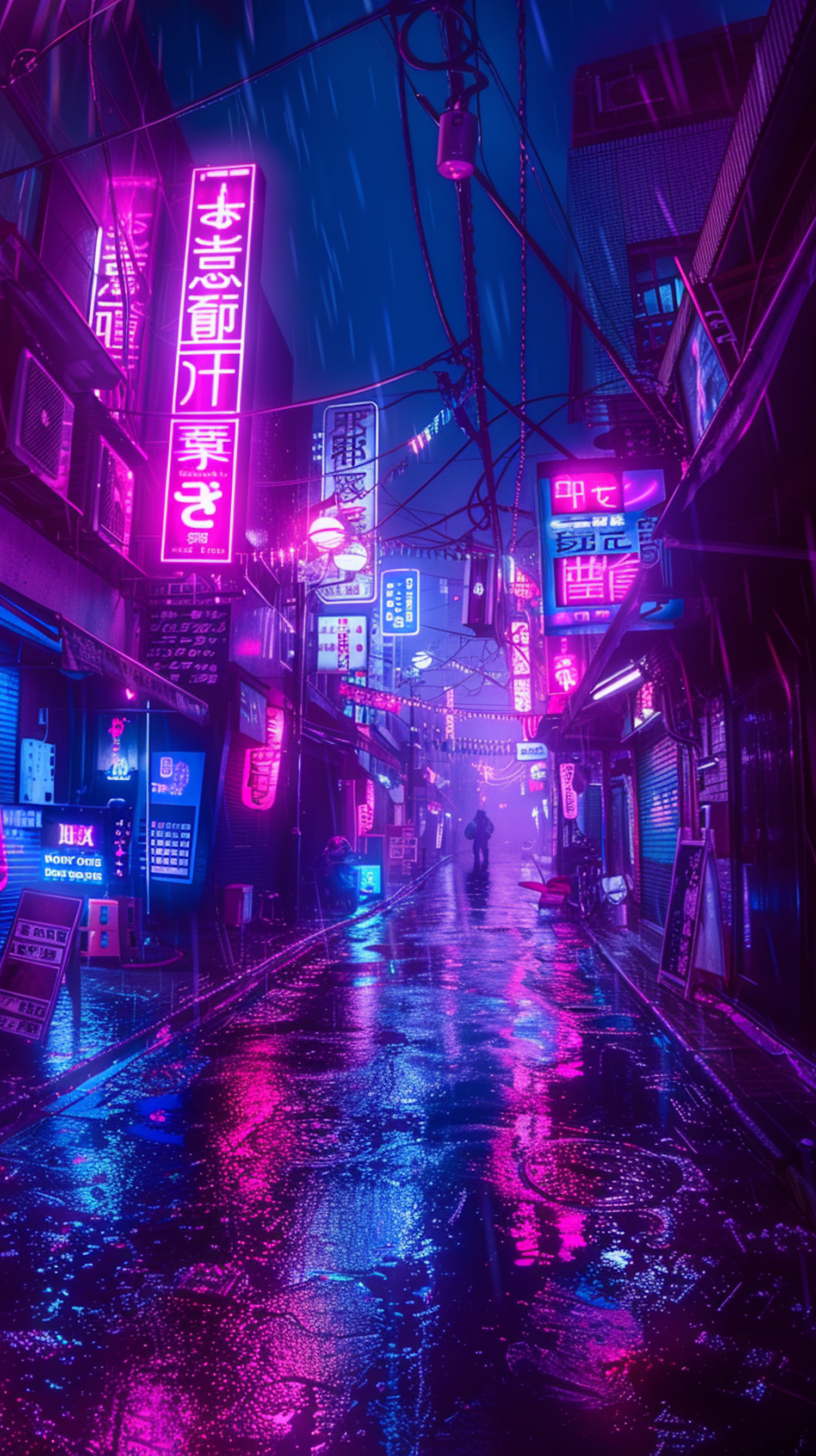 Vibrant neon-lit alleyway at night with rain-soaked streets and a mysterious figure walking, creating a moody urban atmosphere.