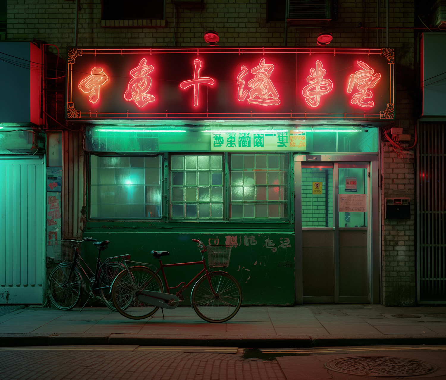 Neon-lit storefront at night with bicycles parked outside, featuring vibrant red and green hues for a serene urban atmosphere.
