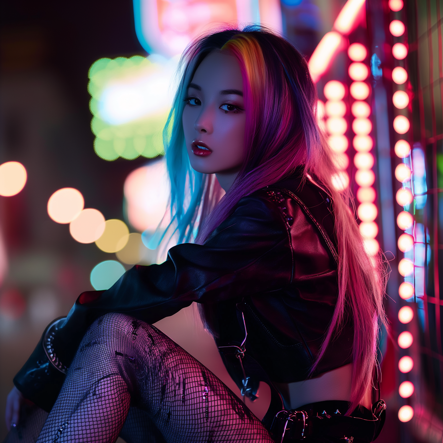 Asian woman with rainbow hair and leather jacket in neon-lit urban setting, exuding edgy style and confidence.