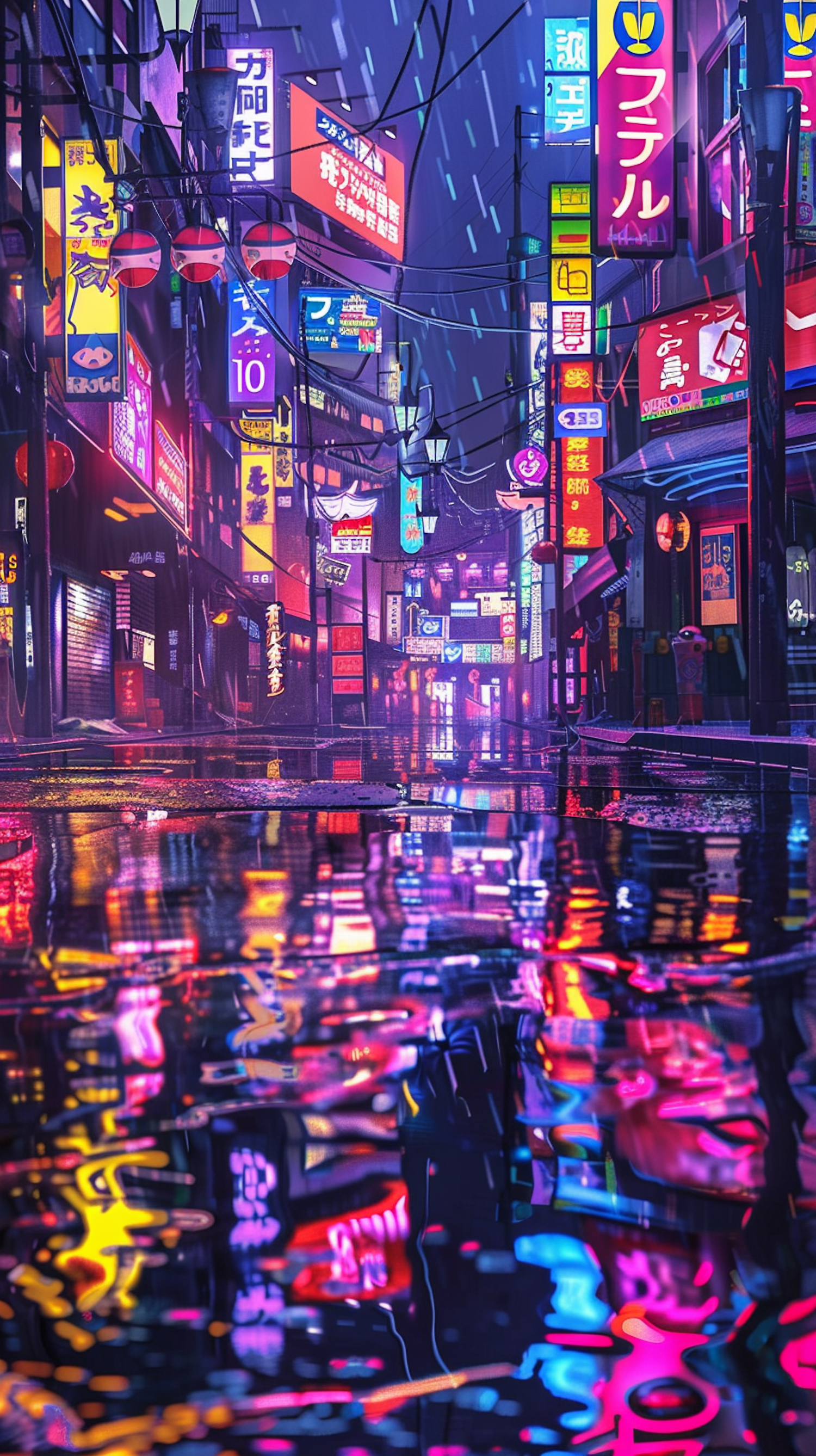 Vibrant neon-lit urban street at night with Japanese signs, wet reflections, and a cyberpunk atmosphere.