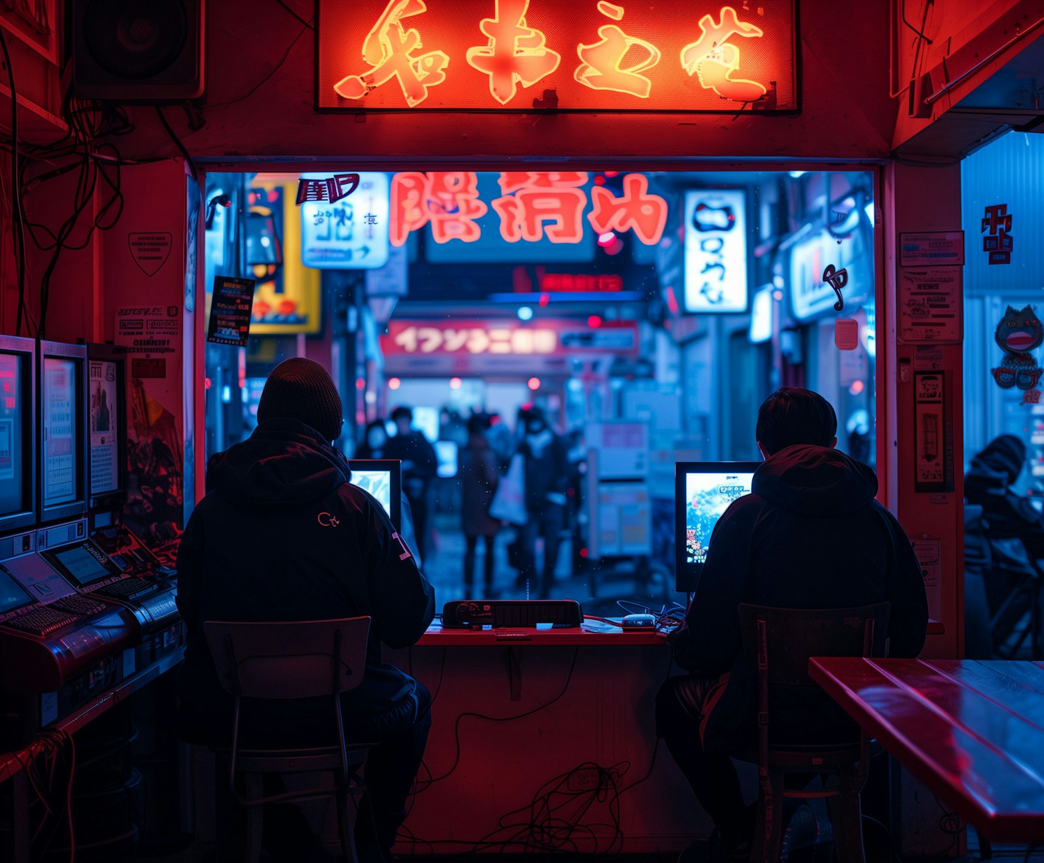 Two people play video games in a neon-lit arcade, surrounded by vibrant red and blue lights, with a bustling street outside.