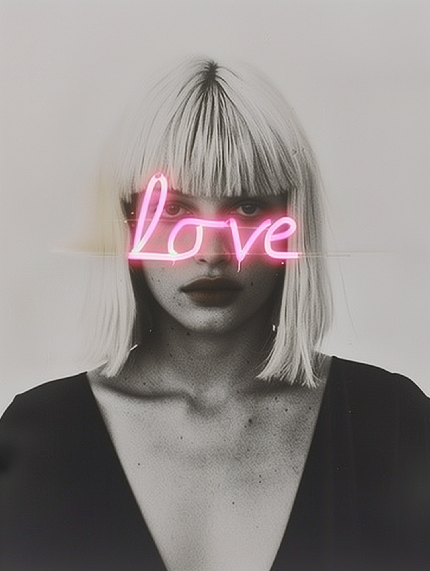 Black and white portrait with neon pink 'Love' text across eyes, featuring a woman with blonde hair and a neutral expression.