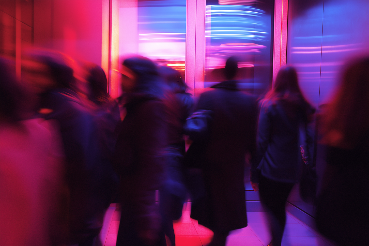 Blurred motion of people walking under vibrant pink and blue neon lights, creating a dynamic and futuristic urban vibe.
