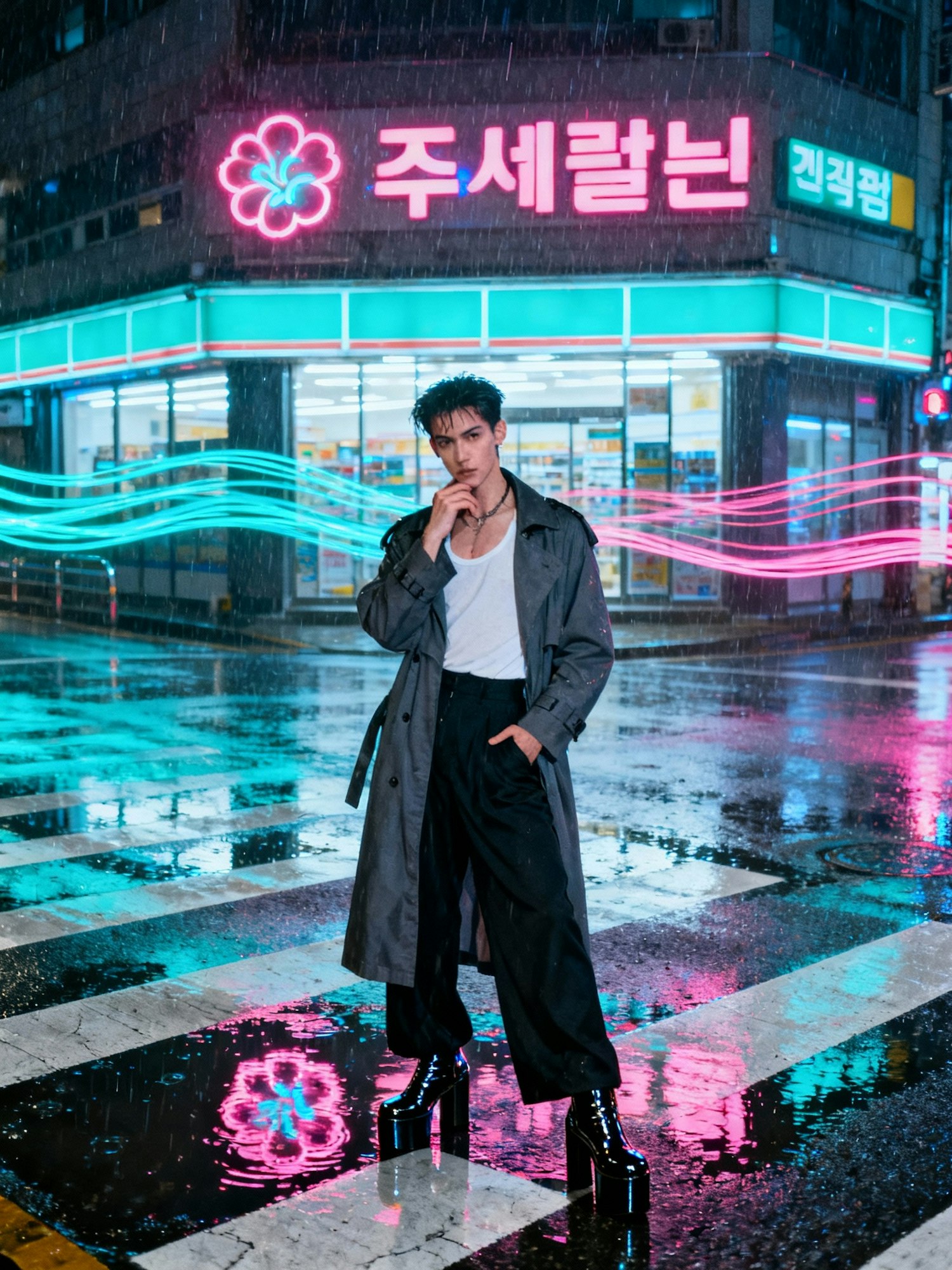 A realistic street-photography fashion image captured 'across the street' in Seoul, monsoon season 2025, midnight. Neon reflections pool on wet asphalt, slicing the scene into ribbons of cyan and magenta. A solitary dancer — mid-twenties, androgynous, radiating quiet rebellion — pauses in an empty crosswalk beneath the shimmer of a convenience store sign. They wear an oversized charcoal trench coat draped over a vintage white tank, wide-legged black trousers, and gleaming platform boots that mirror the city’s electric chaos. Their pose is defiant yet unposed — one hand tucked into a pocket, the other resting near their jaw as they look toward the camera with subtle challenge, droplets catching in their lashes. The humid air clings to the light at 6200 K, soft yet vibrant. Captured on a Canon R5 with RF 50 mm f/1.8 lens at f/2, 1/800 s, 14-bit dynamic range, 68 MP equivalent, fine Portra 400 grain, smooth edge falloff, organic lens flare, and spectral neon bokeh blooming into the Seoul midnight rain.
