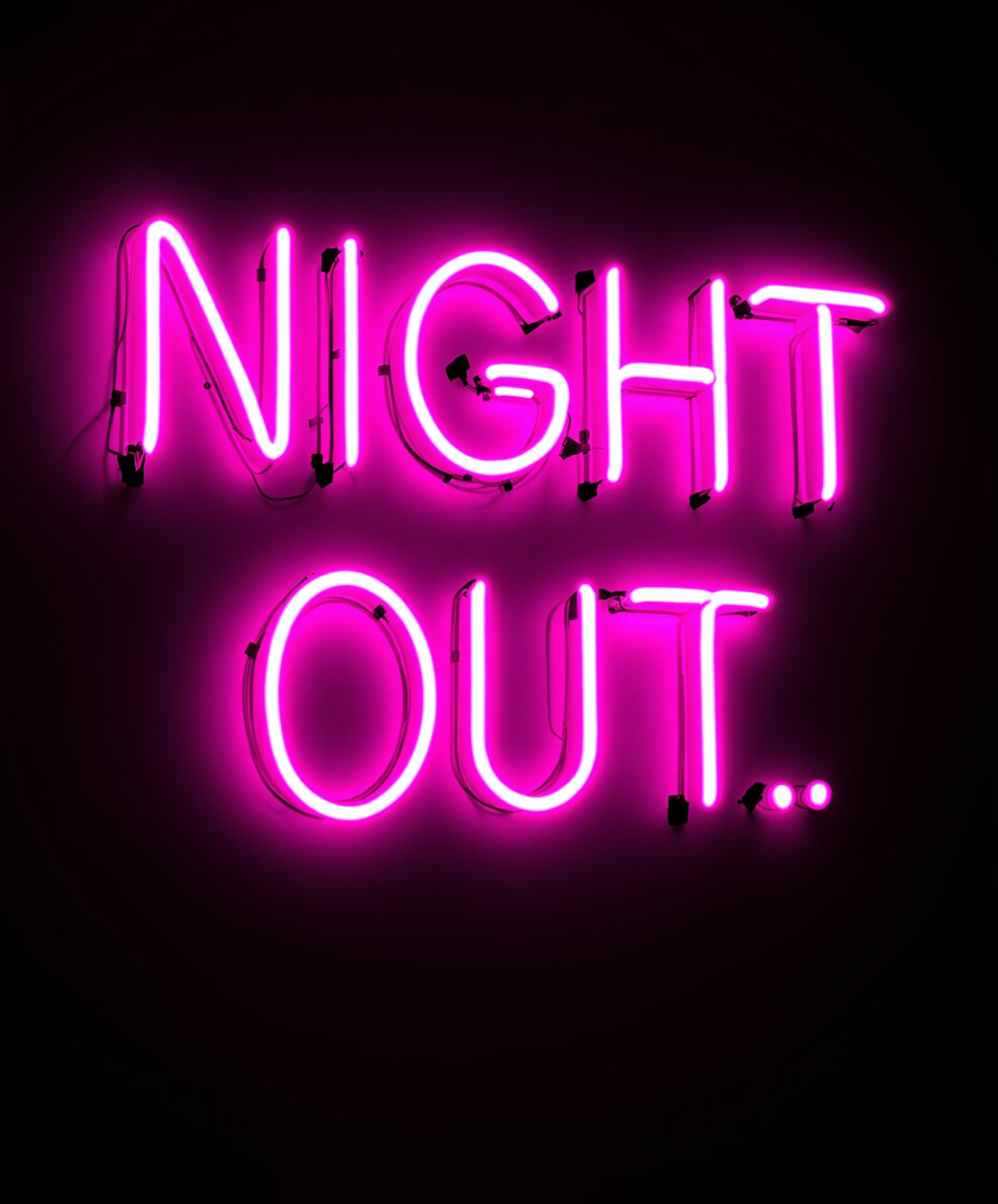 Bright pink neon sign reading 'NIGHT OUT..' against a dark background, perfect for nightlife or party-themed visuals.