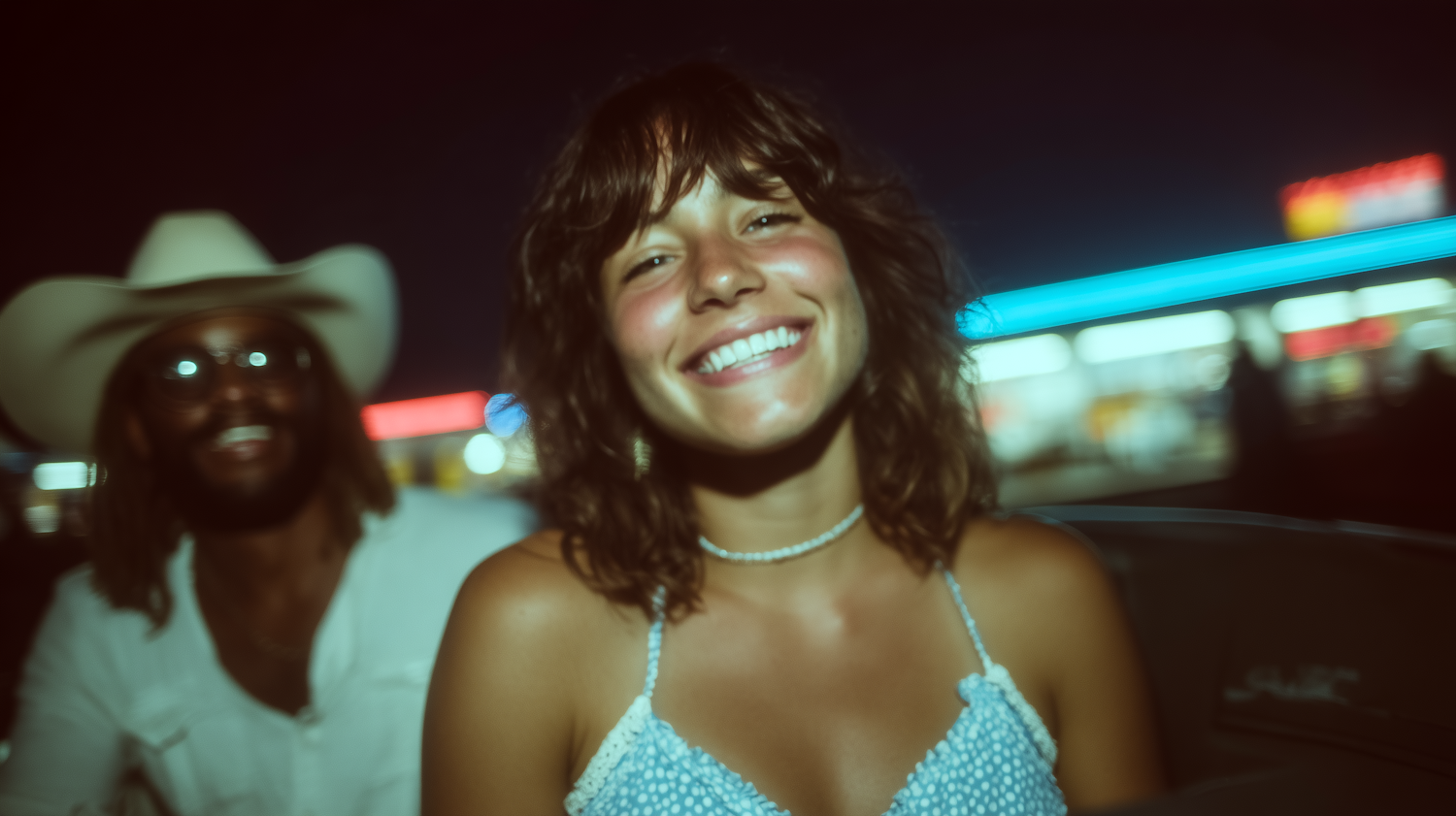 A smiling woman in a polka-dot dress enjoys a night out, with neon lights and a companion in the background adding a lively vibe.