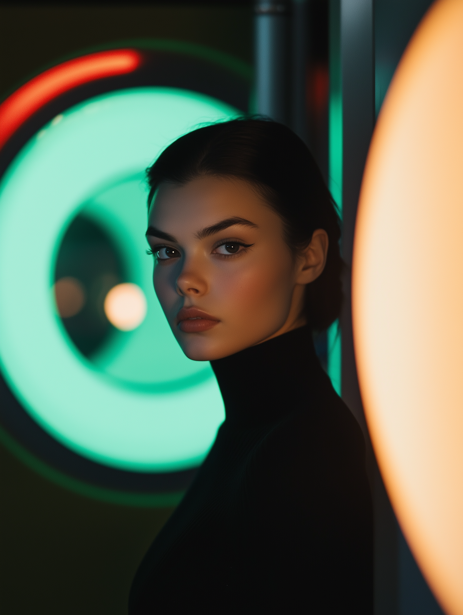 A striking portrait of a woman in a black turtleneck, set against vibrant neon green and orange lights for a modern, artistic vibe.
