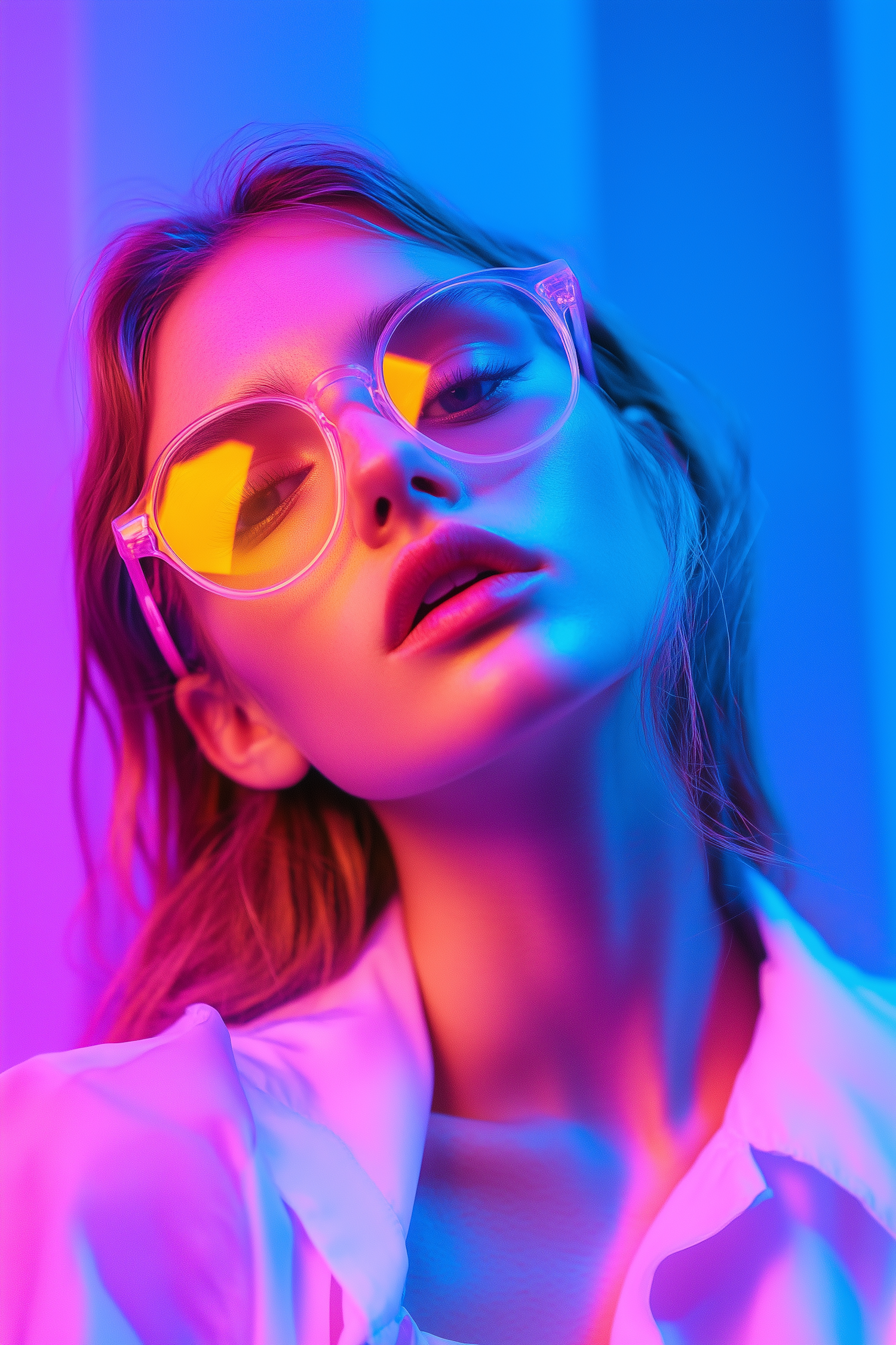 Vibrant neon portrait of a woman in yellow-tinted sunglasses, glowing in pink, blue, and purple hues. Futuristic and artistic vibe.