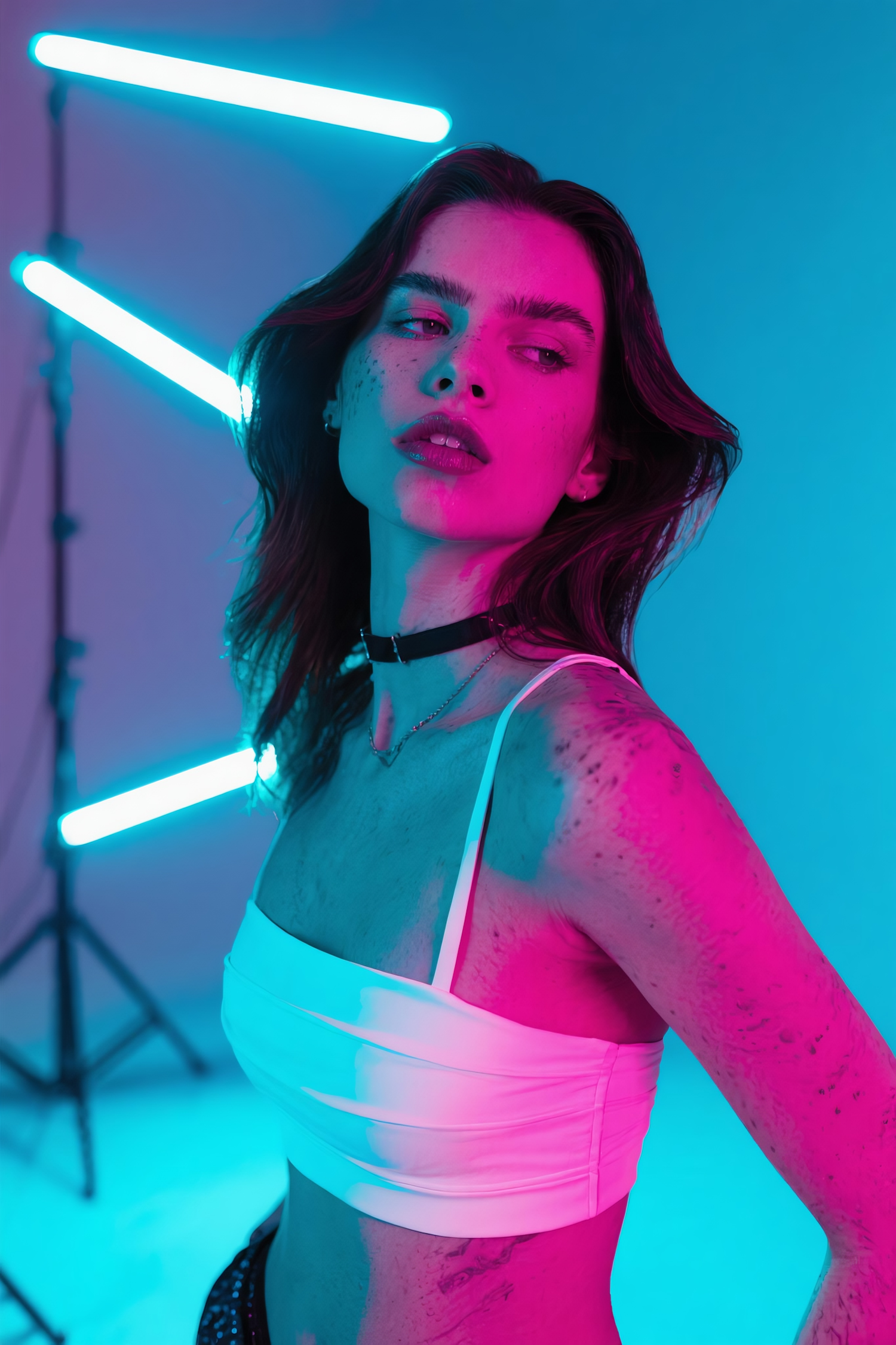 A woman in vibrant pink and blue lighting, wearing a white crop top and black choker, with neon lights in the background.