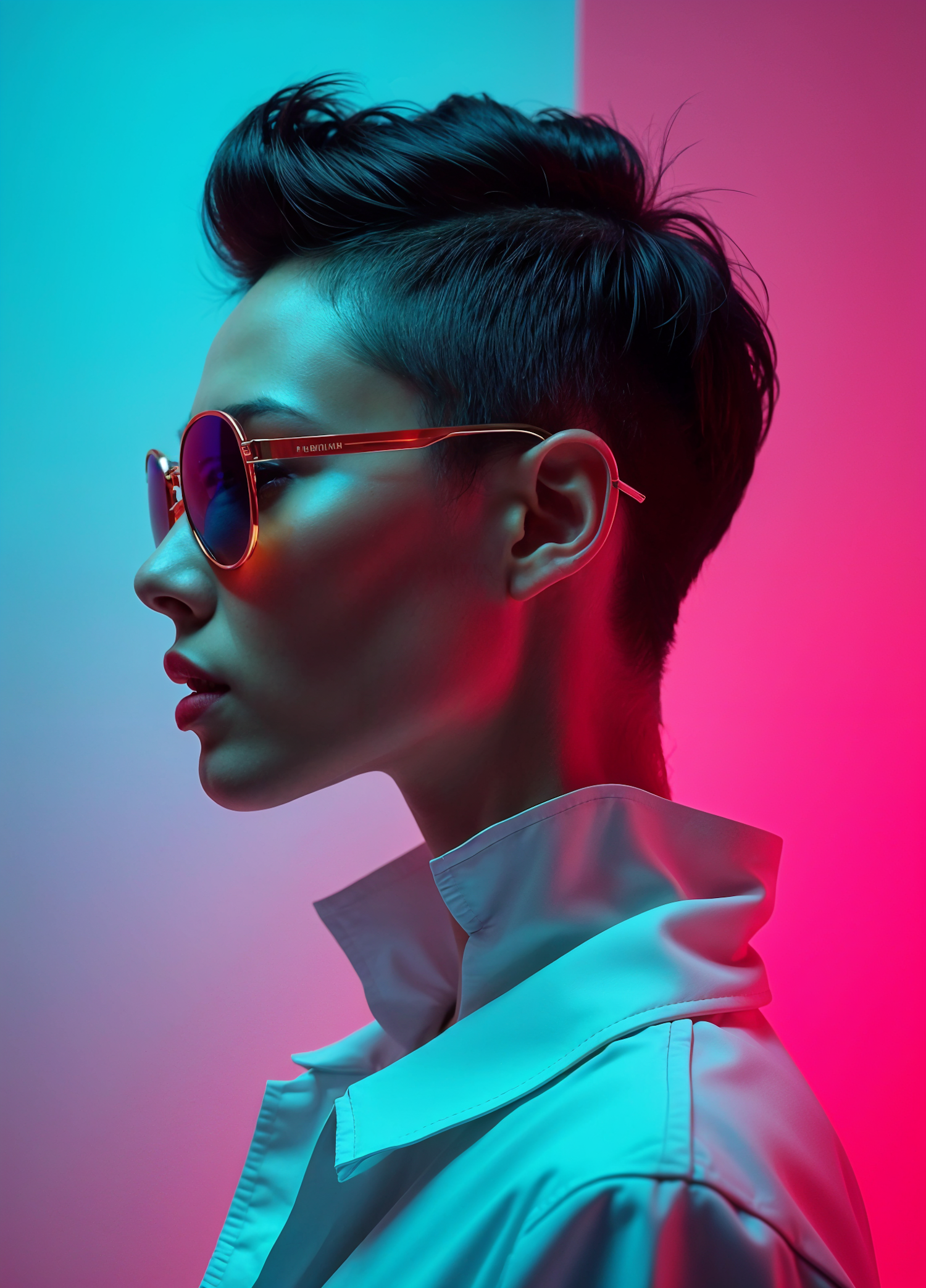 Stylish portrait with neon lighting, reflective sunglasses, and a sleek white jacket. Futuristic vibes with bold blue and pink hues.