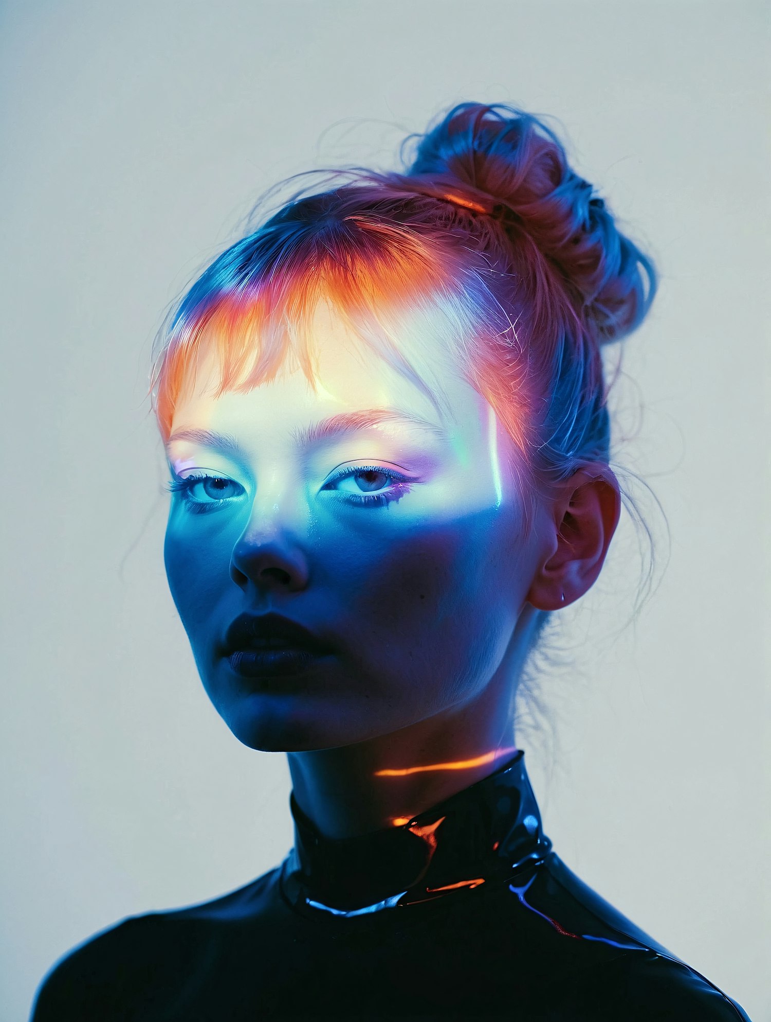A futuristic portrait of a woman with neon lights casting vibrant blue, orange, and pink hues on her face, styled with a messy bun and glossy outfit.