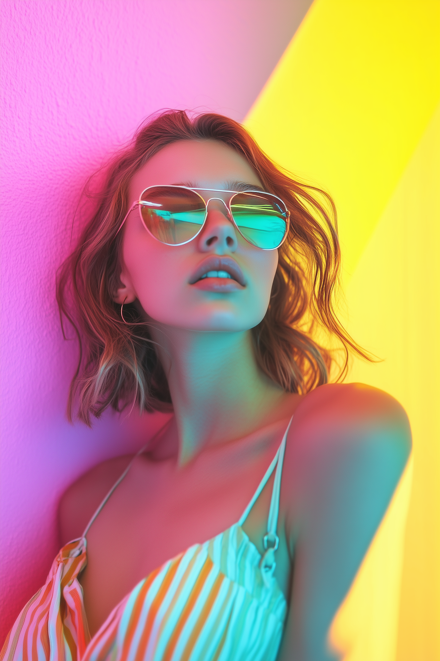 Stylish woman in aviator sunglasses and striped top, bathed in vibrant pink and yellow neon lighting for a dreamy, modern vibe.