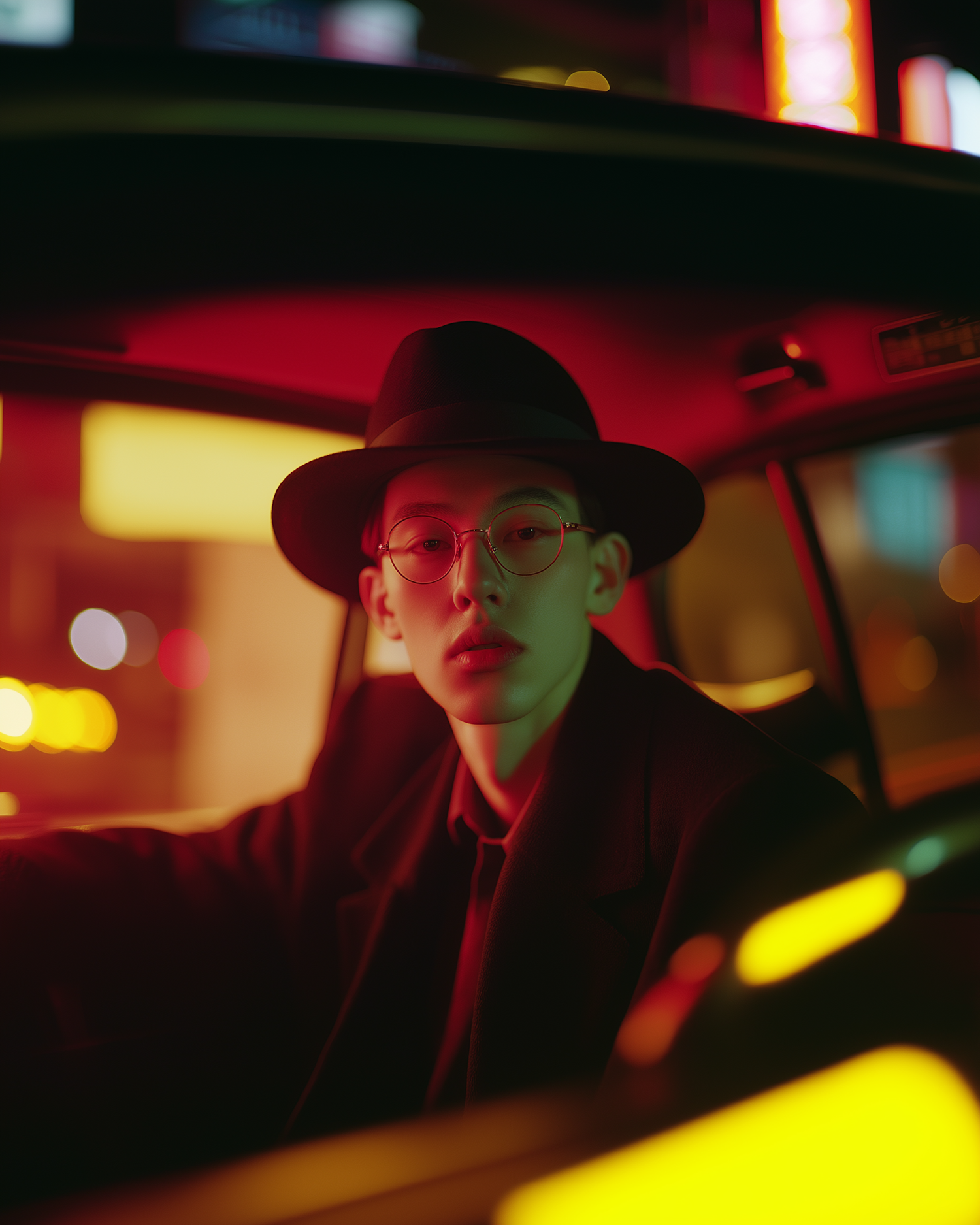 Stylish individual in a car, illuminated by neon lights, wearing a fedora and glasses, creating a moody urban vibe.