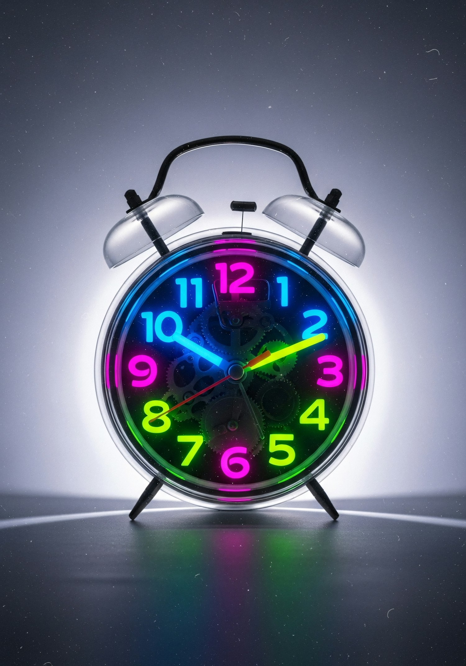 A retro-style alarm clock with neon-lit numbers and visible gears, glowing vibrantly against a softly lit background.