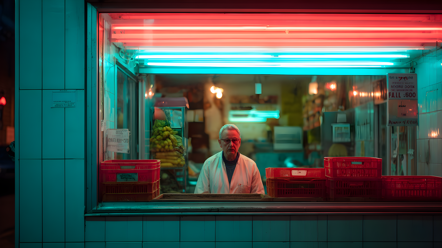 A shopkeeper in a white coat stands behind a counter, framed by vibrant neon lights and surrounded by colorful crates and produce.
