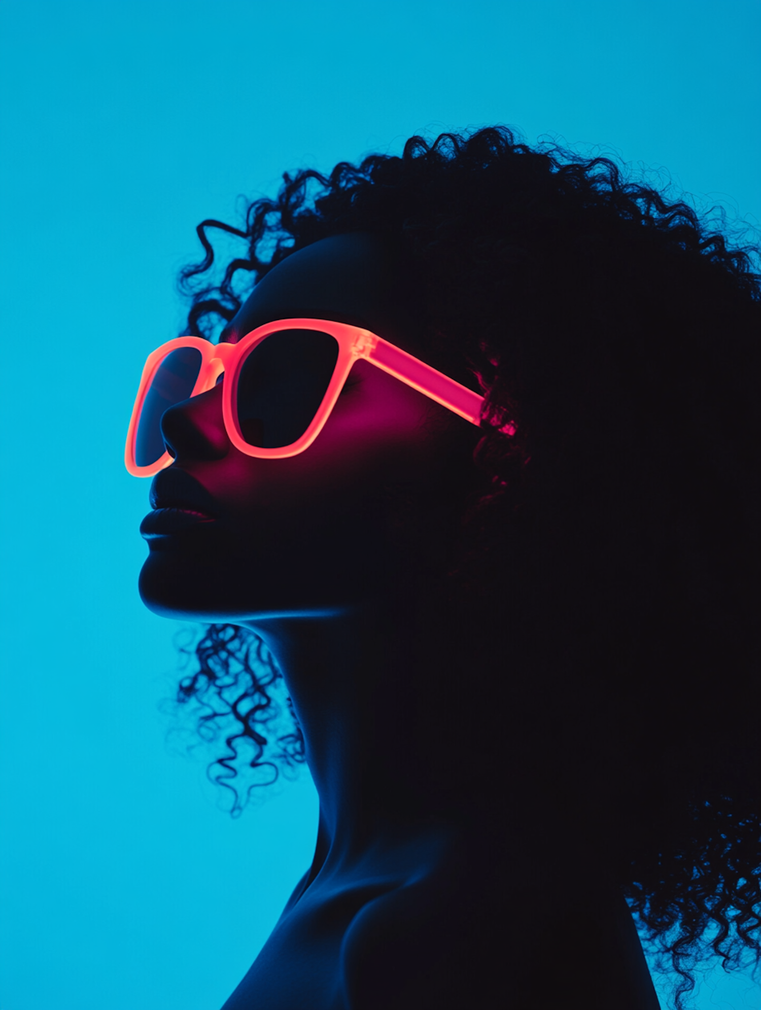 Silhouette of a person with curly hair wearing glowing neon pink sunglasses against a vibrant blue background. Bold and futuristic vibe.