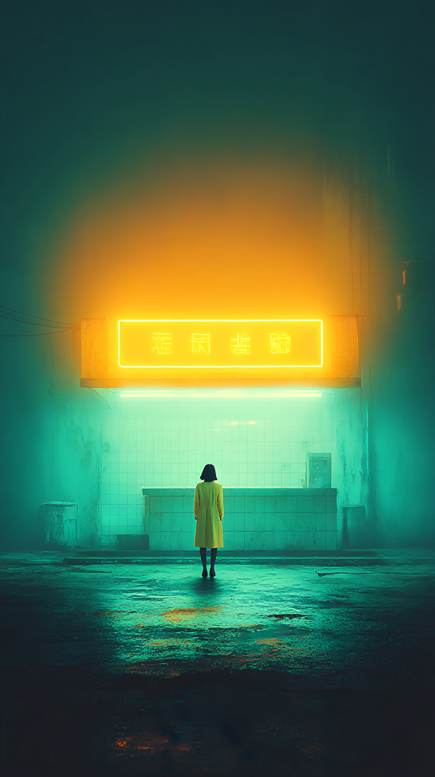 A person in a yellow coat stands under a glowing neon sign in a moody, teal-lit urban setting, creating a cinematic and mysterious atmosphere.