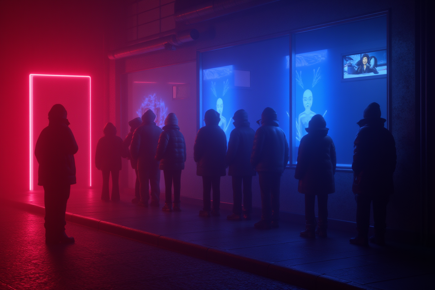 A surreal scene of hooded figures in neon red and blue light, standing by a glowing storefront with futuristic imagery. Mysterious and cinematic.